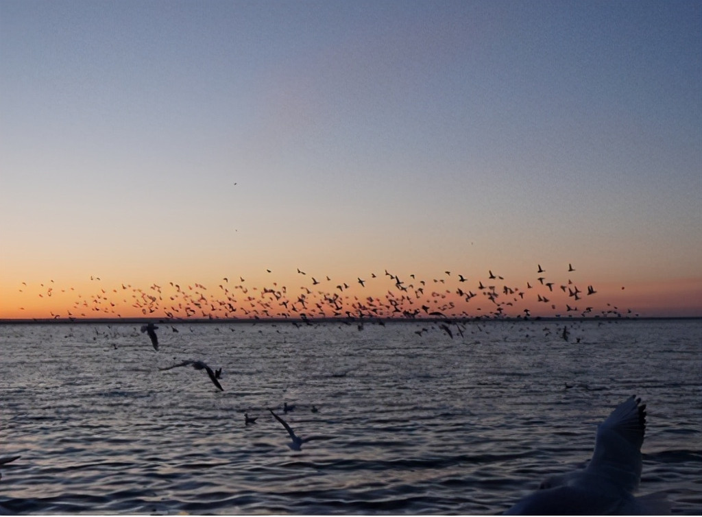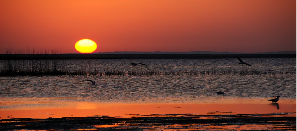 早上的居延海日出非常美,每年都有成百上千的摄影爱好者来这边拍摄美丽的居延海日出,还有成群结队的海鸥。