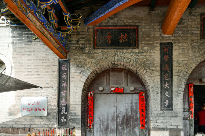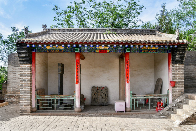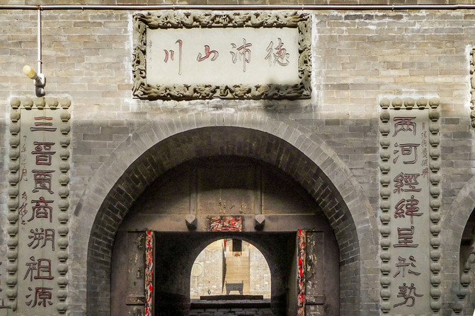左侧拱门,上嵌石匾“锁碛”。 中间门洞石匾“德沛山川”。对联是:两河经纬呈形势,三晋贾商溯祖源。 右侧拱门嵌着石匾“屏风”。
