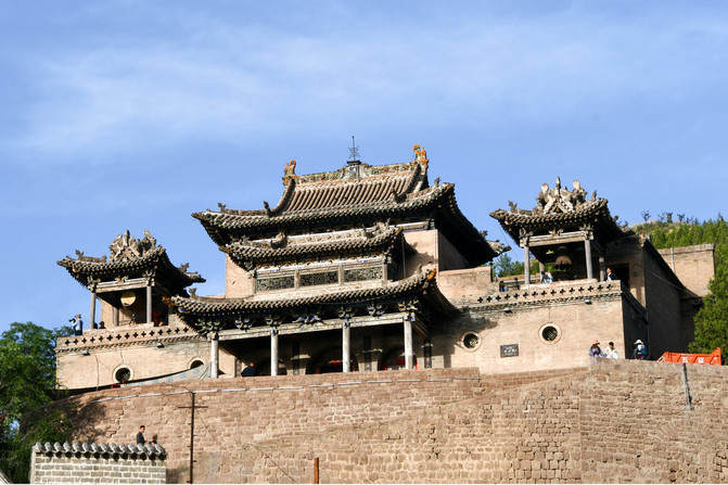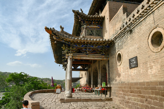 沿西厢房向南登上乐楼,可以登台远眺,倚庙廊俯而环视四周,古老的 碛口 镇尽收眼底,山、水、镇、庙在 黄河 巍谷之间相映成趣,而 黄河 对面,就是 陕西 省了。