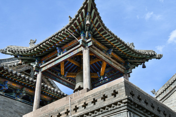 戏台左右是十字歇山顶式的钟鼓楼,规模不大,却小巧玲珑,别具风格