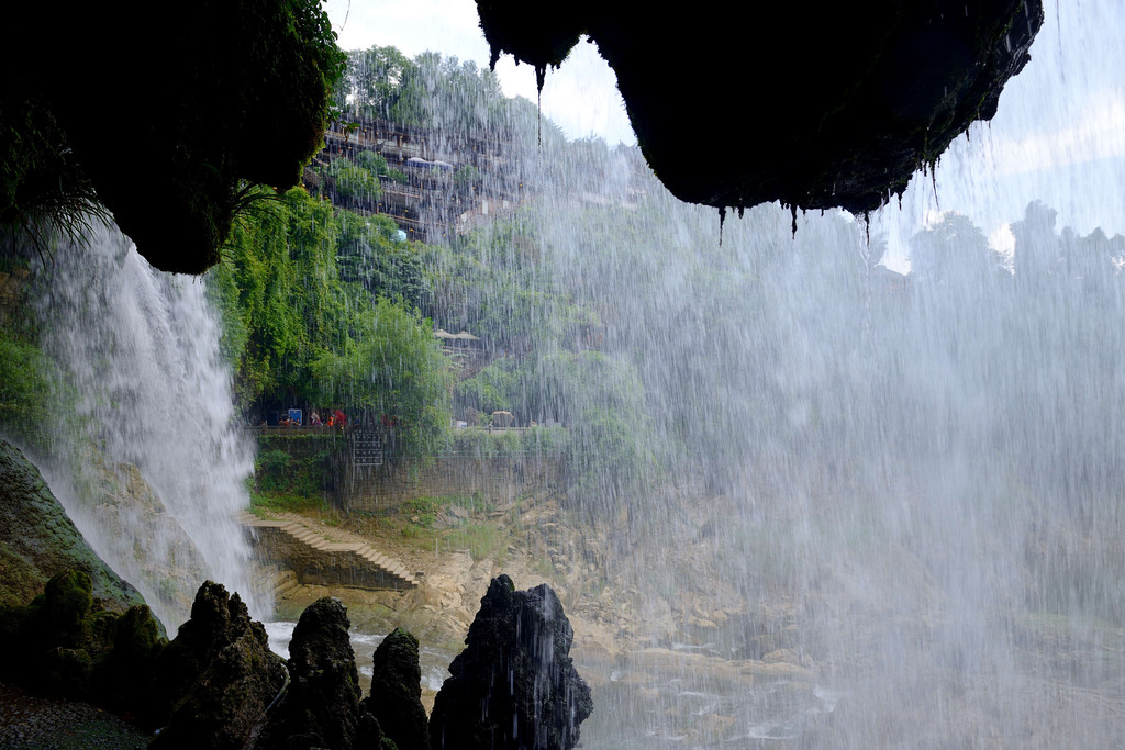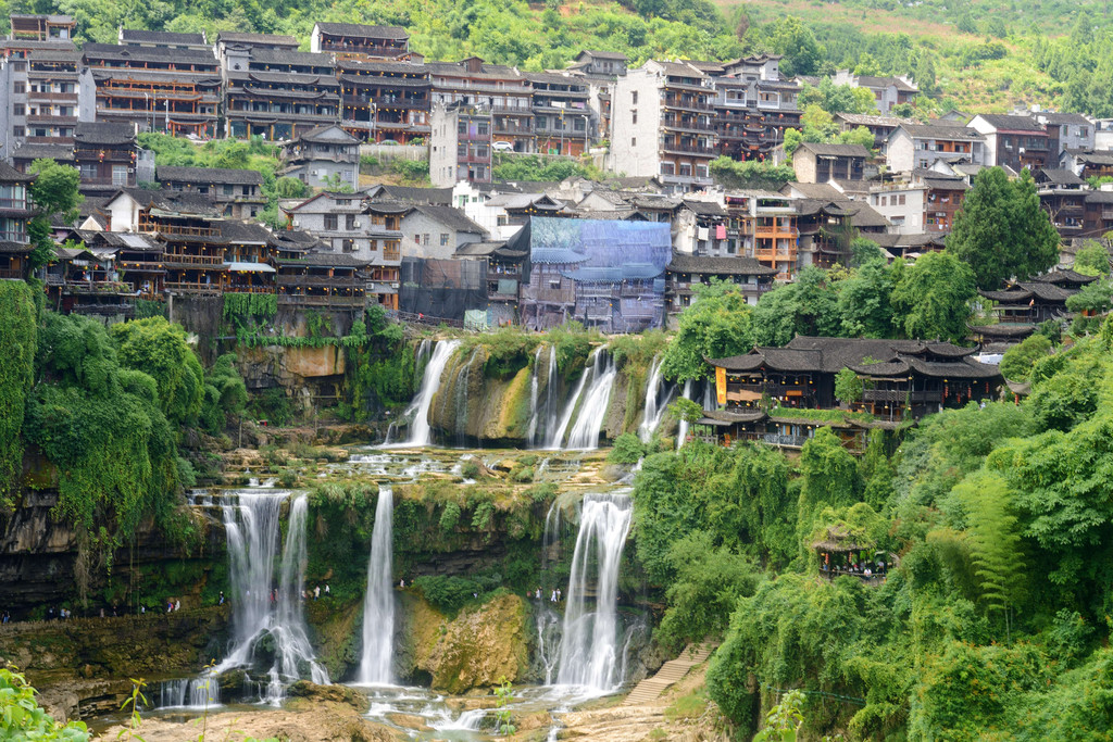 再往前又是一个一个观景平台,可以从多角度观赏瀑布和古镇全貌。