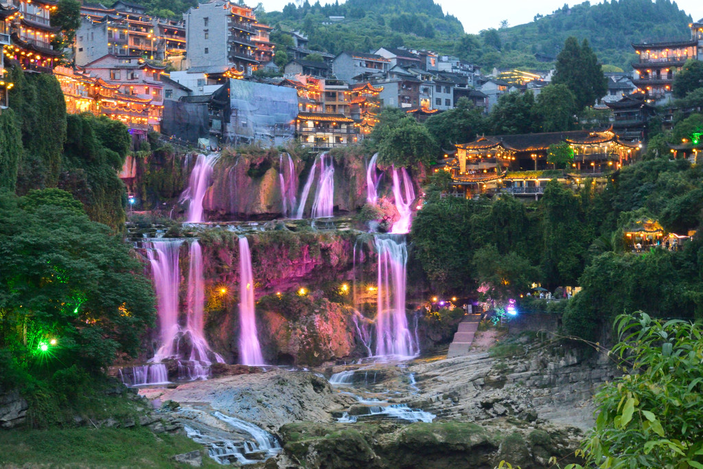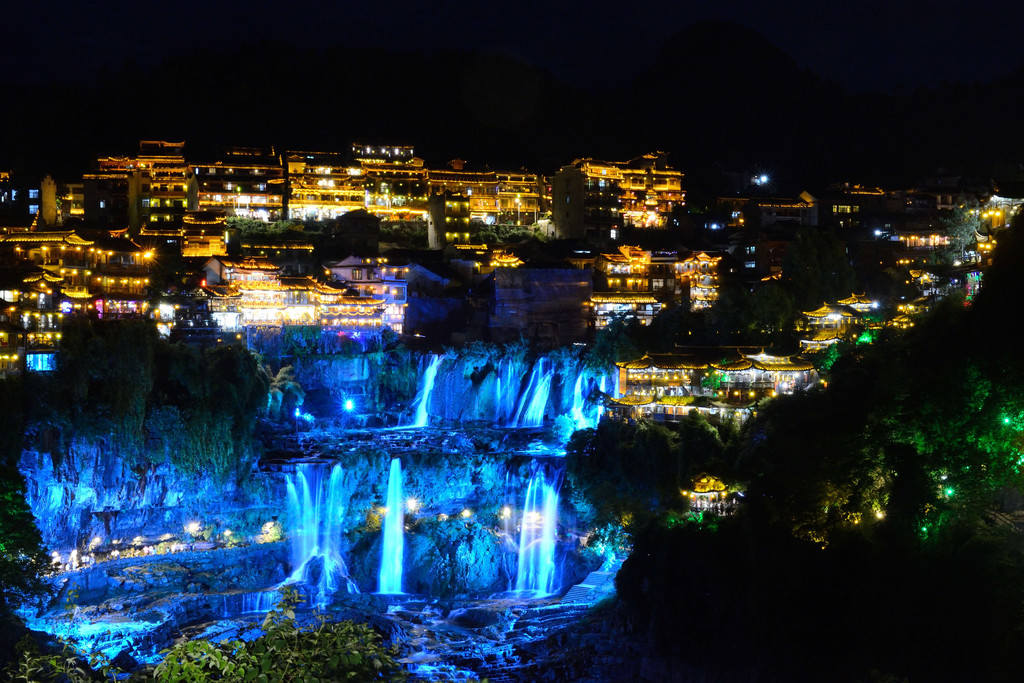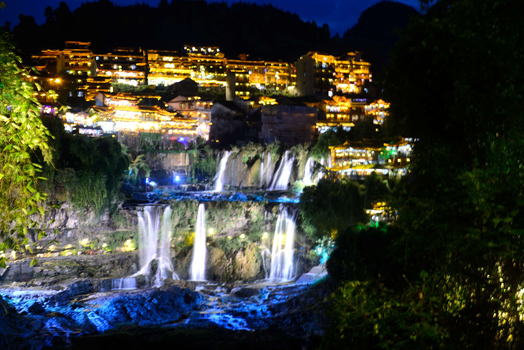 8点歌舞开始,瀑布周围的彩灯也开始绽放,随着灯光的变换,景色变幻莫测-------美啊。再走就是猛洞河了,对面是古丈县。