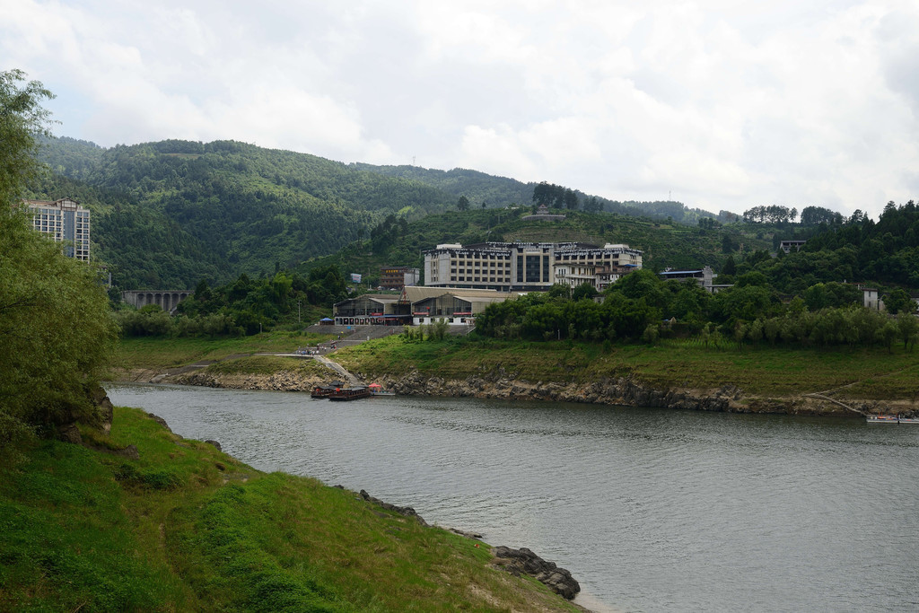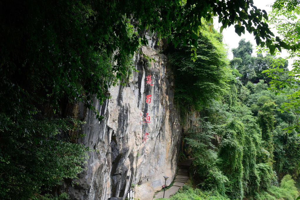继续沿悬崖栈道走,在幅石壁上着唐寅写的“楚蜀通津”四个大字。