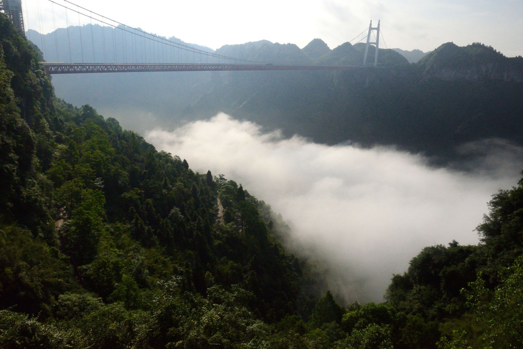 车子一直往318国道山上爬,大桥就在头上转来转去,不断变换角度。到了半山腰的一个纪念碑,师傅停车让我下去拍摄,我看角度不好就继续往上走。300多米后来到一个平台,我叫师傅停车。这时,云海在大桥下翻腾,但由于逆光,拍摄效果有点差。