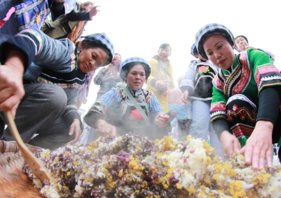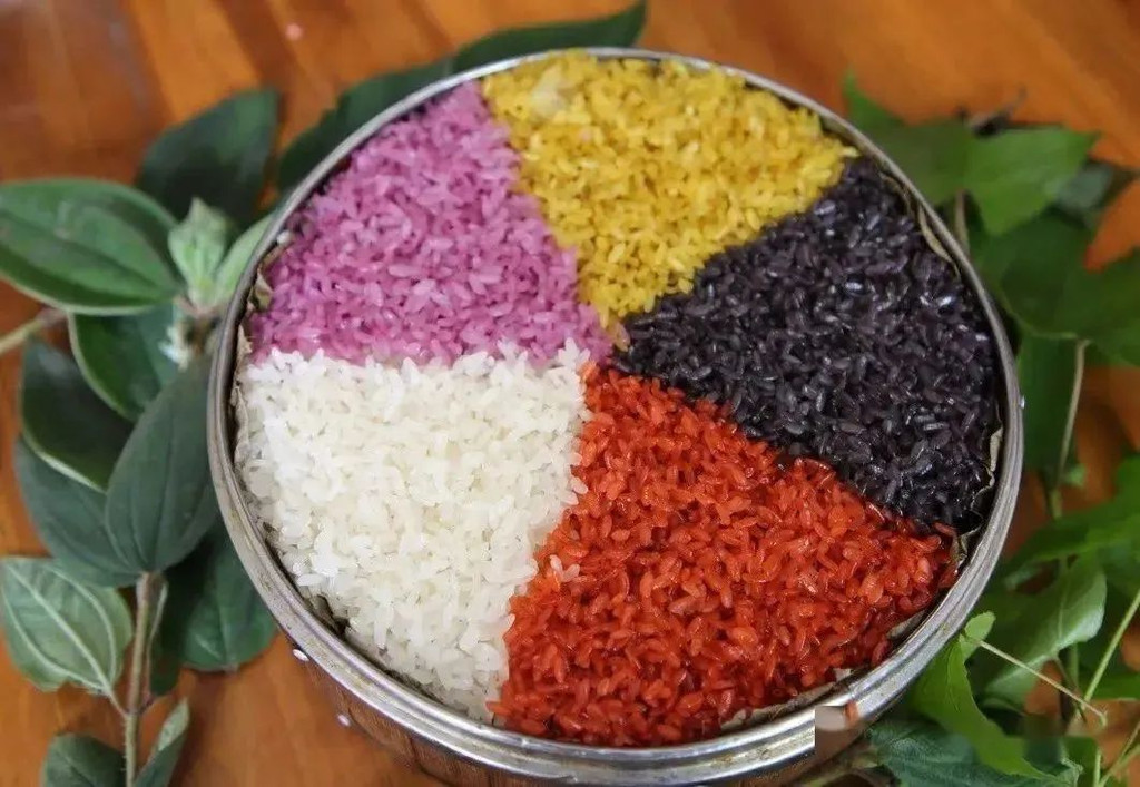 每到农历三月三前后,布依族的人们都会制作五色花米饭。花米饭是用上好糯米染成各种颜色,蒸熟后混合搅拌而成。一般有黑、白、红、黄、紫等色,花米饭不但色彩鲜艳,而且回味悠长!