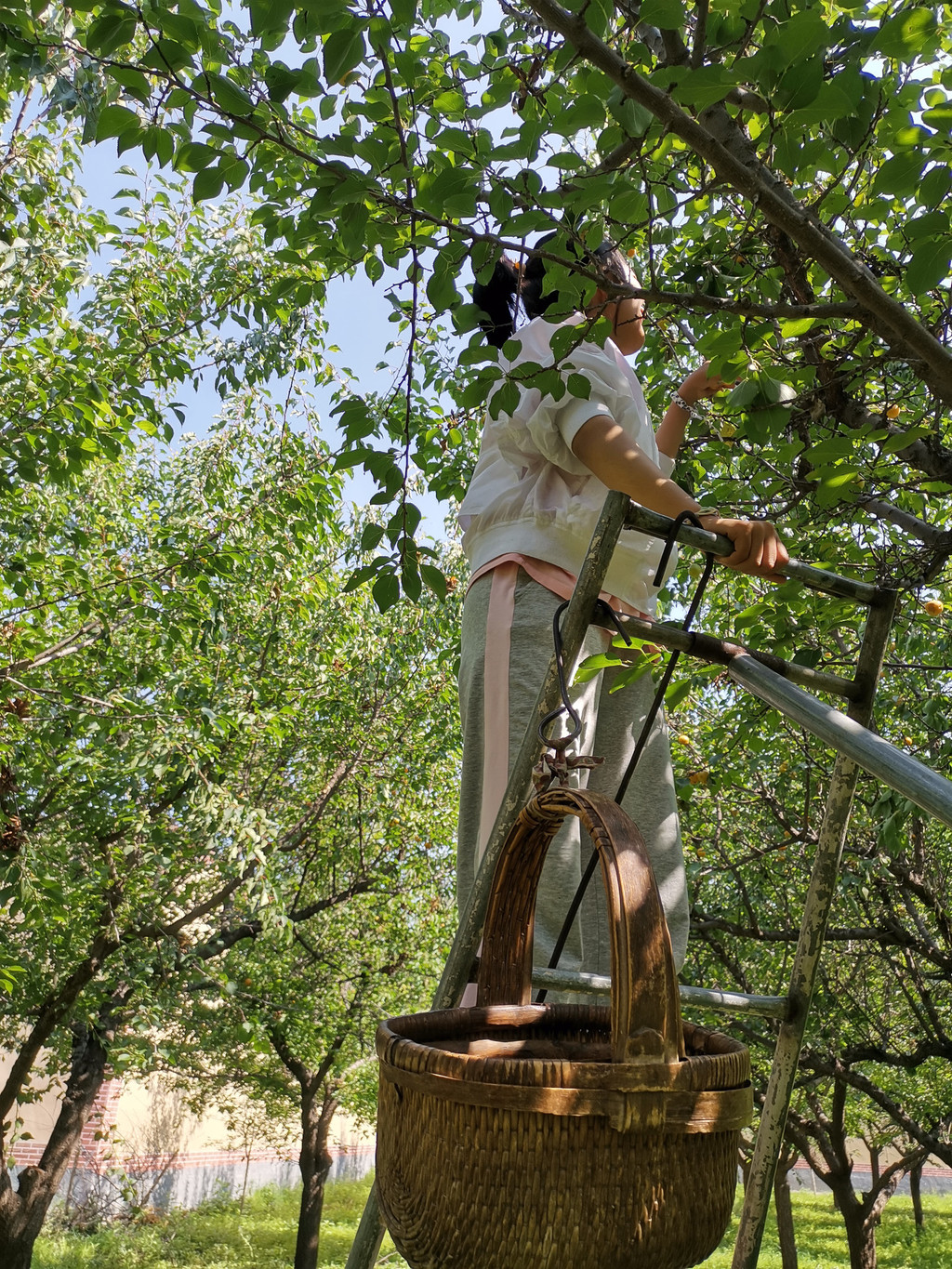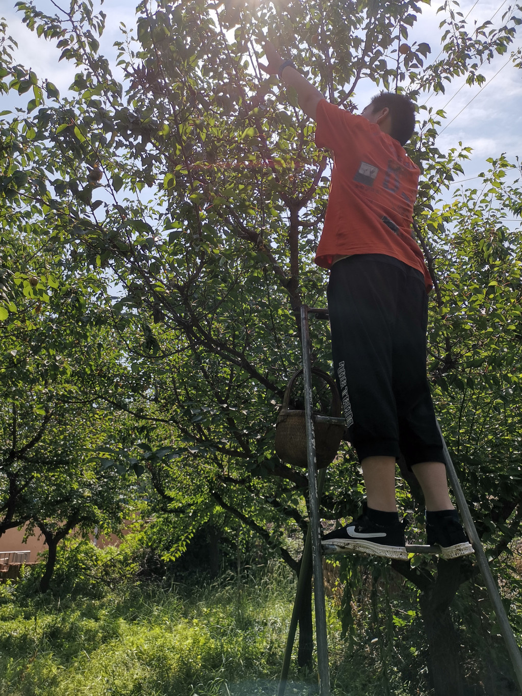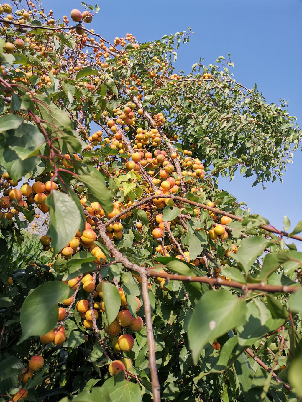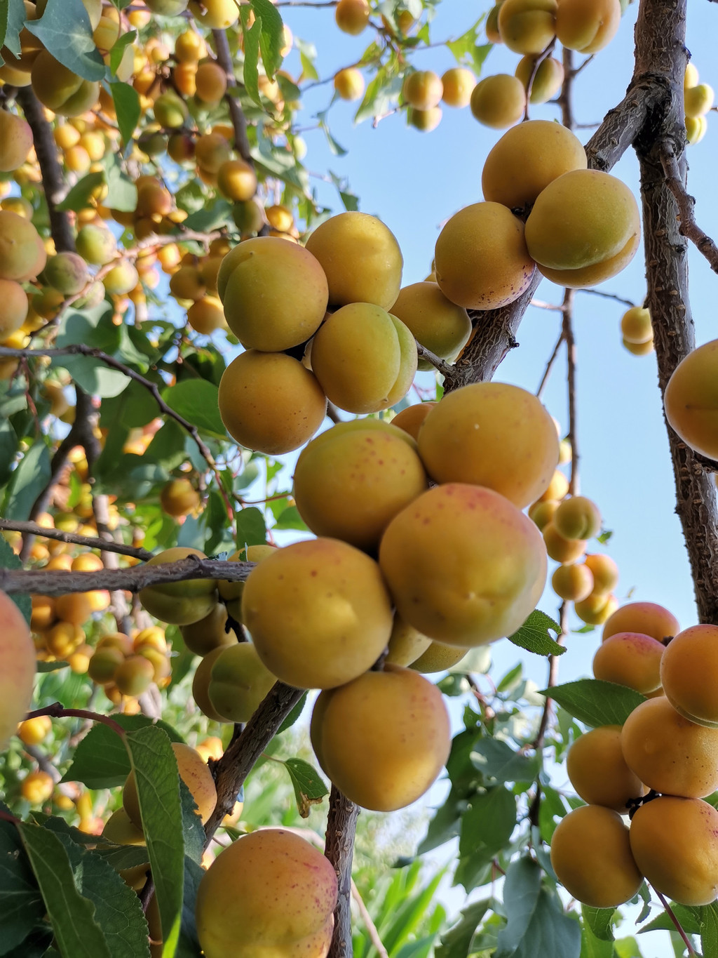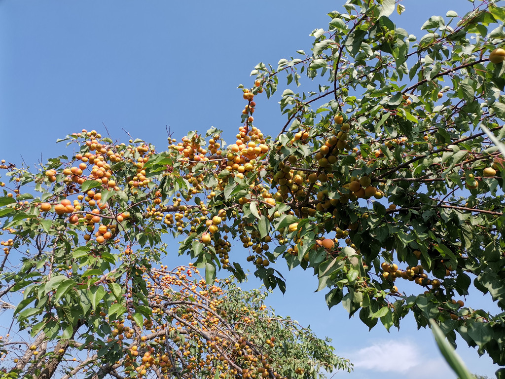 七月杏香,从早到晚,田间地头,沙沟上下,不是摘杏人,就是买杏人和卖杏人。引梯、克劳、蓝蓝是摘杏人必备的“三件套”,人当然是必须的。支引梯是一件技术活,支好了,克劳里满满当当,支不好,蓝蓝里屈指可数。上上下下之间,早已汗流浃背,不过为了这碎银几两,顾不得许多了。兰驼车、电动车、摩托车以及小轿车来来往往,交通堵塞是常有的事,尤其是以沙沟三岔路口为最甚。叫卖声、喇叭声声声入耳,热头越强,买卖越好,要是遇上一场过雨,沙沟里不见人影不说,树上的杏也是纷纷落地,再也风光不起来了。即便是赖在树上,也早已成为歪瓜裂枣,无人问津了。这不是没有先例。