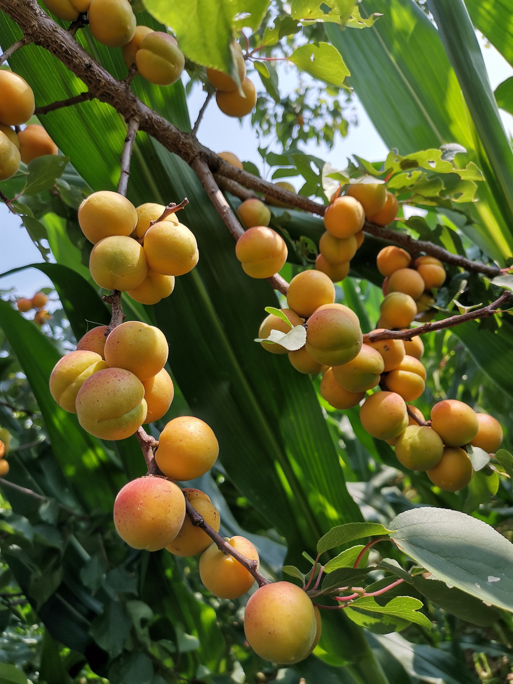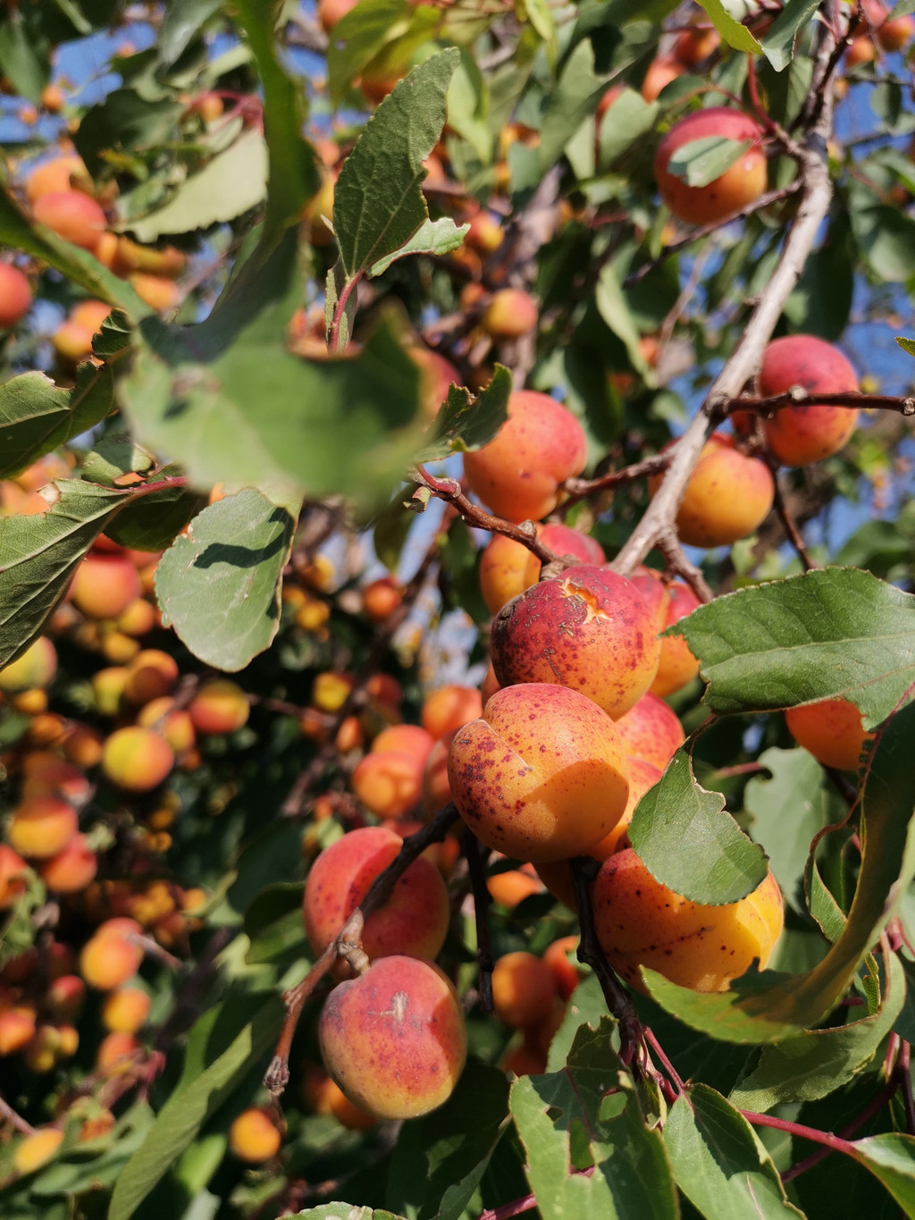在舀水村,发现了编号001的百年古杏树,满身都是沧桑,褶皱里全是历史,累累硕果诉说着遥远的故事。一块包谷地里,一树的野杏金黄中带着紫红,鲜艳在枝头上,结的杏让树枝已不堪重负,有些枝枝叉叉已经断折在了地里,有些也早已摇摇欲坠,树的形状倒有点像披头散发,树上的野杏浓妆艳抹,艳丽的快要裂开了。野杏是卖不上价钱的,可能也入不了树主的眼睛,就这样独自绽放,直到被晒成干杏。野杏吃起来虽然比不得大版杏、包谷杏(xing)香甜味美多汁,却也是自有风味,入嘴绵软悠长。