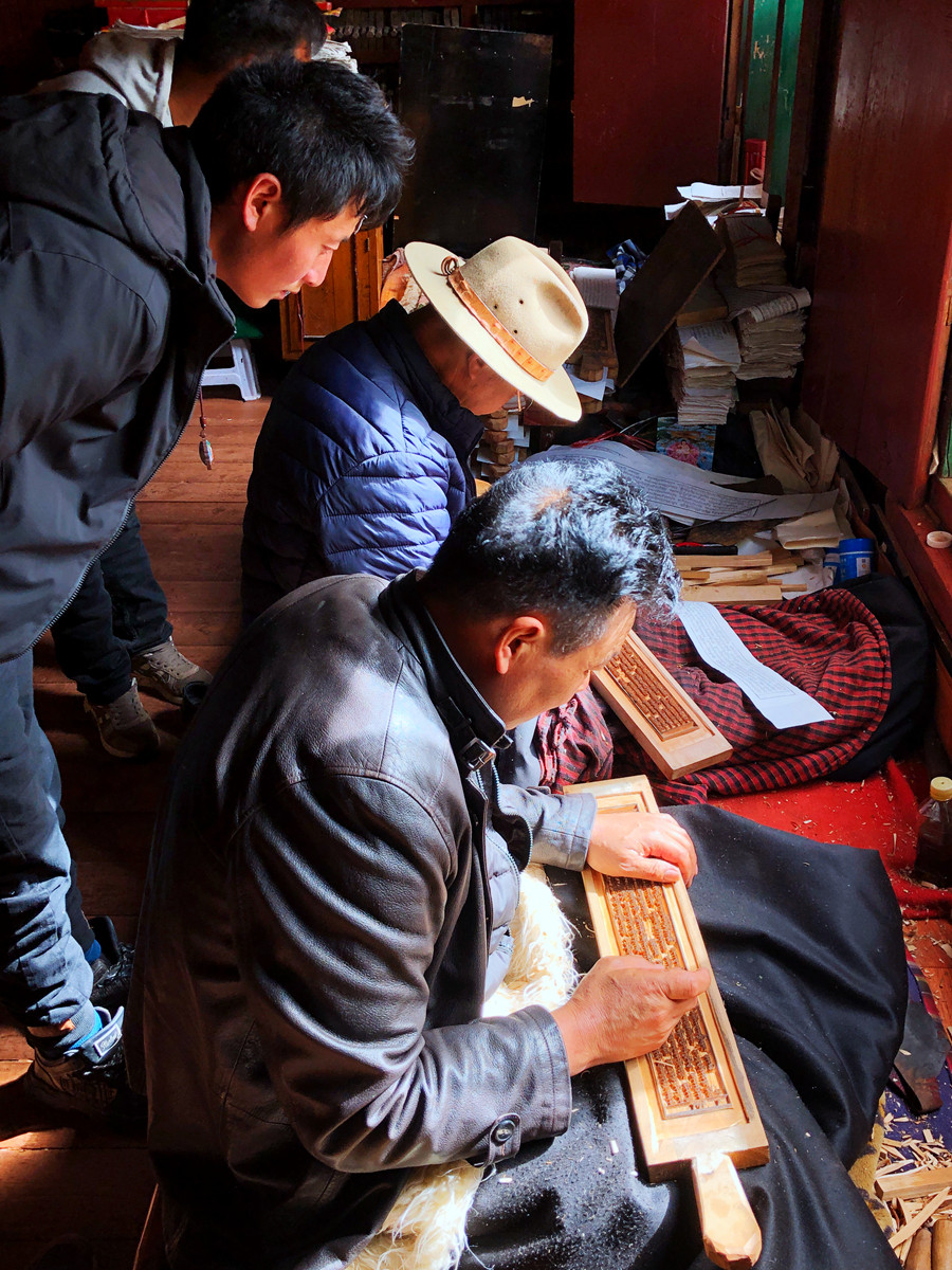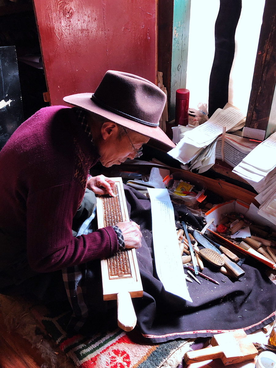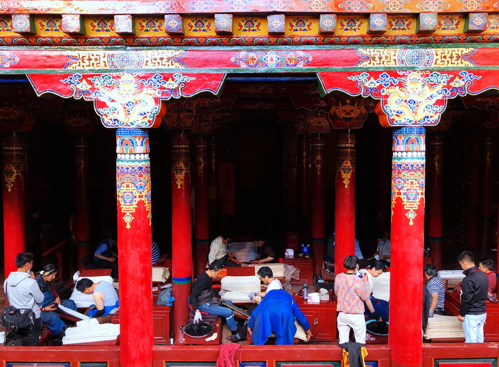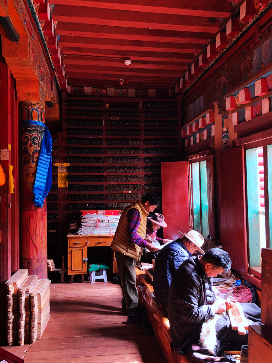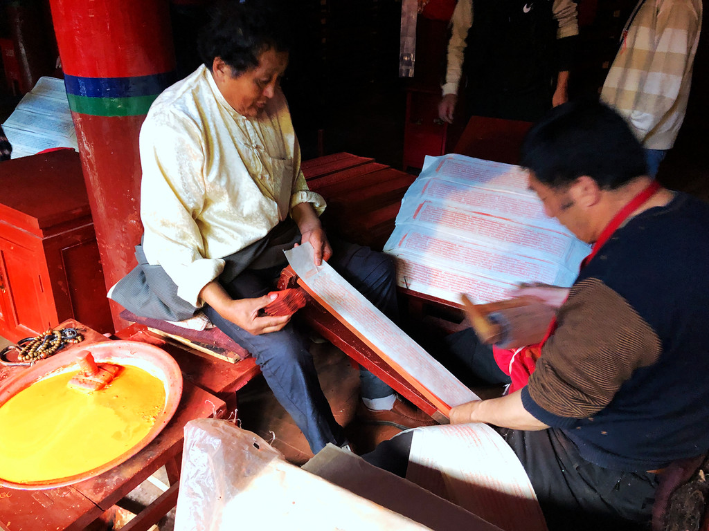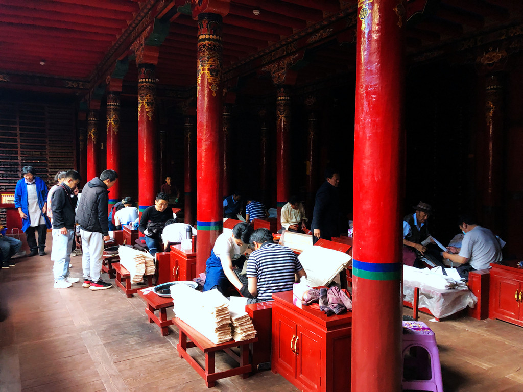 又转到了雕刻印经版工作室,三位匠人正在用工具雕刻着。雕刻用的木料很有讲究,《西藏,西藏》这本书介绍,一定要用青冈木,这种木头质地坚硬。一位匠人告诉我,他是在修复,拿一张经文给我看,上面有一处划了红勾,刻错了,需要改错修复。这位匠人真有意思,问我从哪里来?告诉他:广东。他立刻从一个塑料袋里拿出两枚雕刻好的印章,一枚刻着6字真言,另一枚刻着扎西德勒,说可以卖给我。被我婉言拒绝,因为我未入佛门,不太懂这些东西。