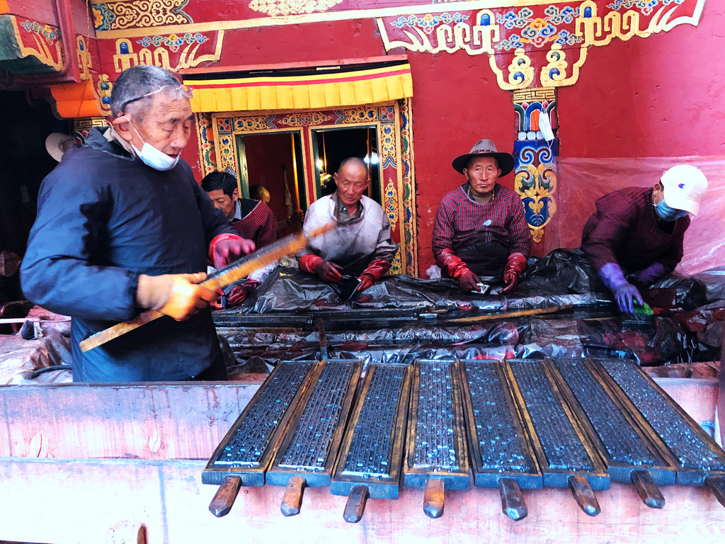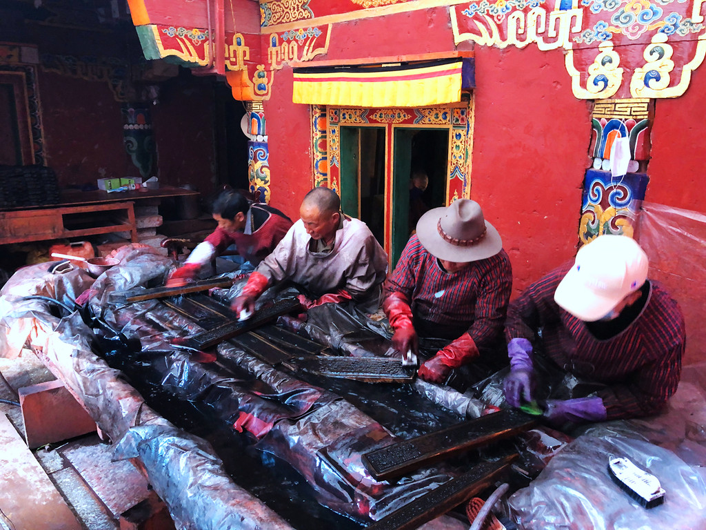 最早见到的是冲洗印经板,几个工作人员在流动的水前,冲洗印经版,将油墨冲洗干净,边劳作边念着经文。