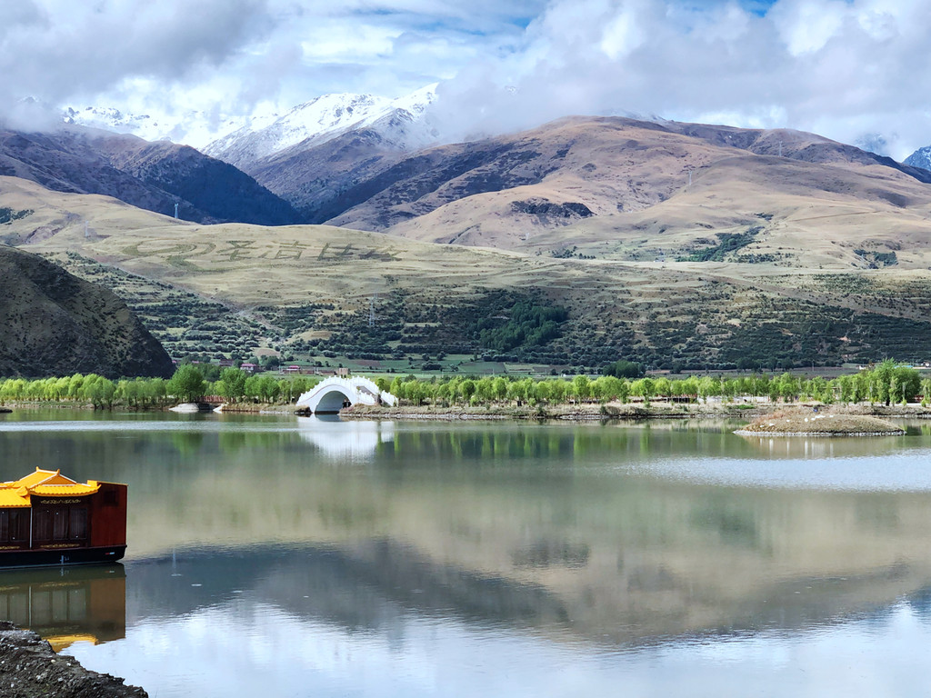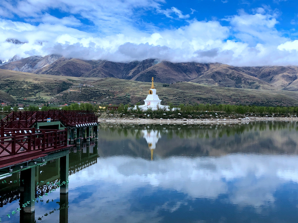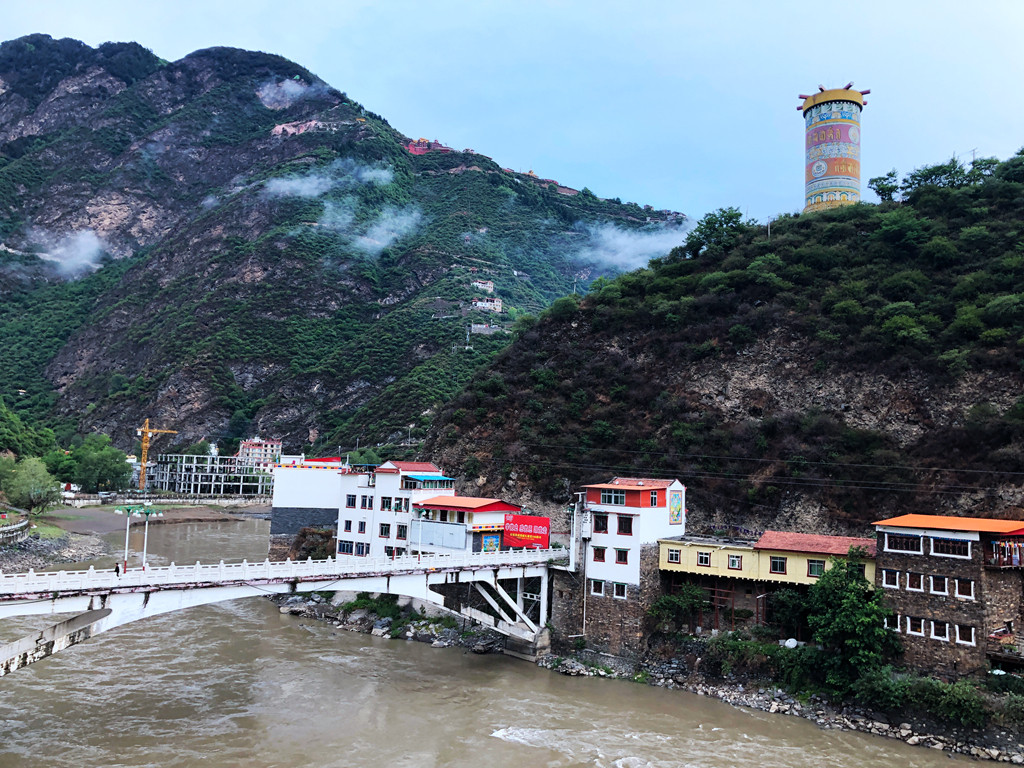 晨起推开窗,一条大河波浪宽,山上云雾缭绕,当地最有名的观音庙就在山顶。河对面山上有一个大大的转经筒,岸边为藏民房舍。