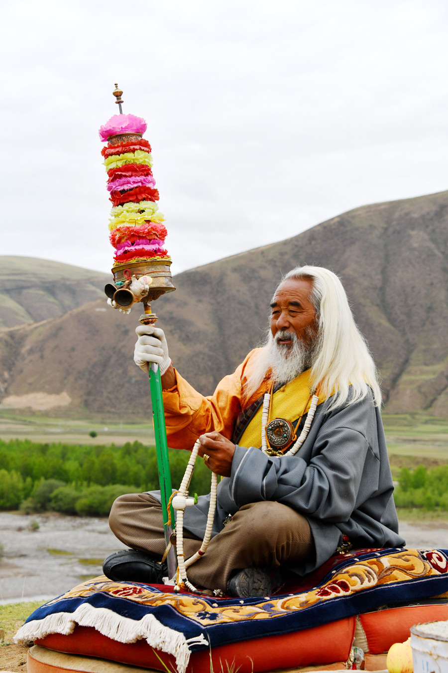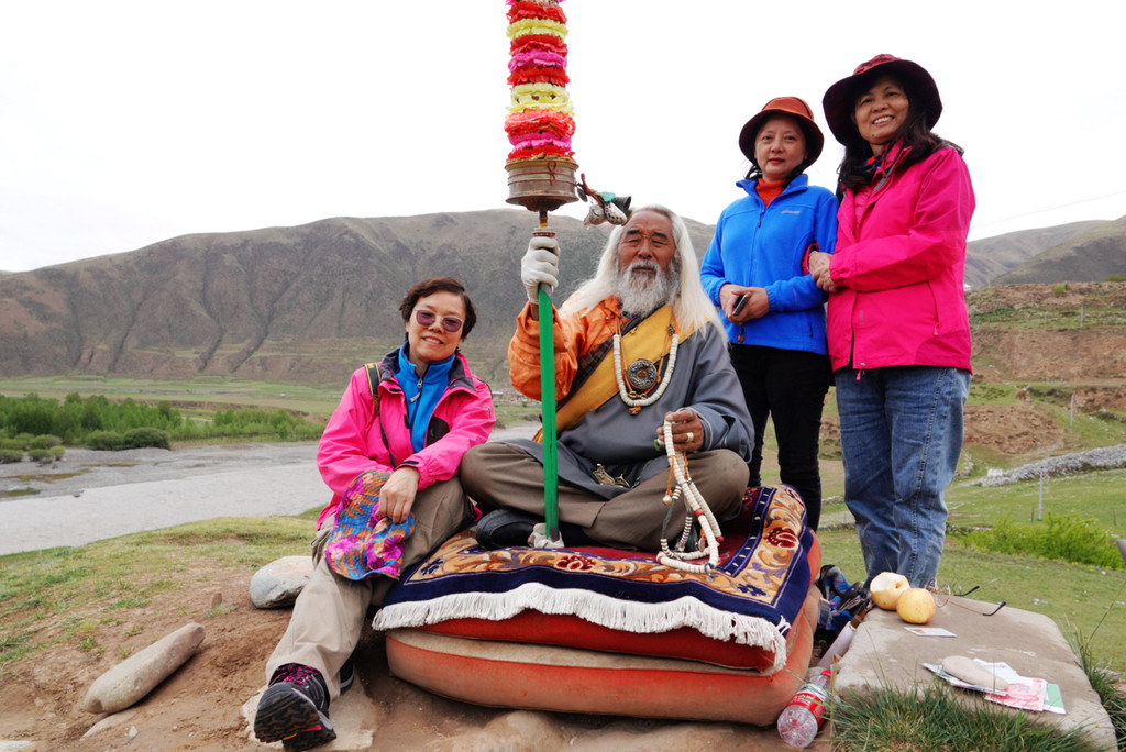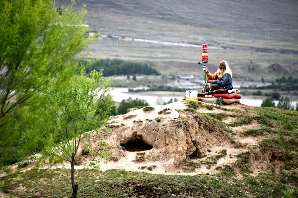行车到来玛村附近雅砻江旁,小伟停下车。见到一位白胡子老藏人坐在小山包上,手中摇着一个大大的经筒。小伟说,那可是317国道上的网红啊,一年365天,几乎每天都在这里转经。难得今天遇上。