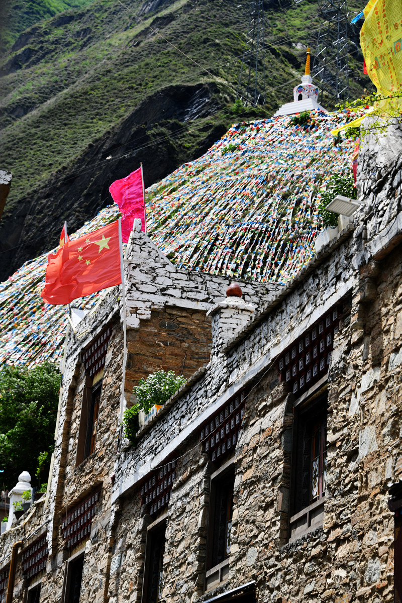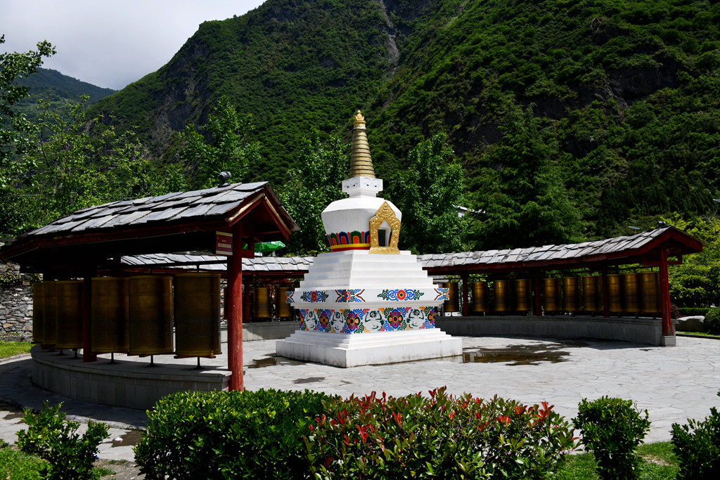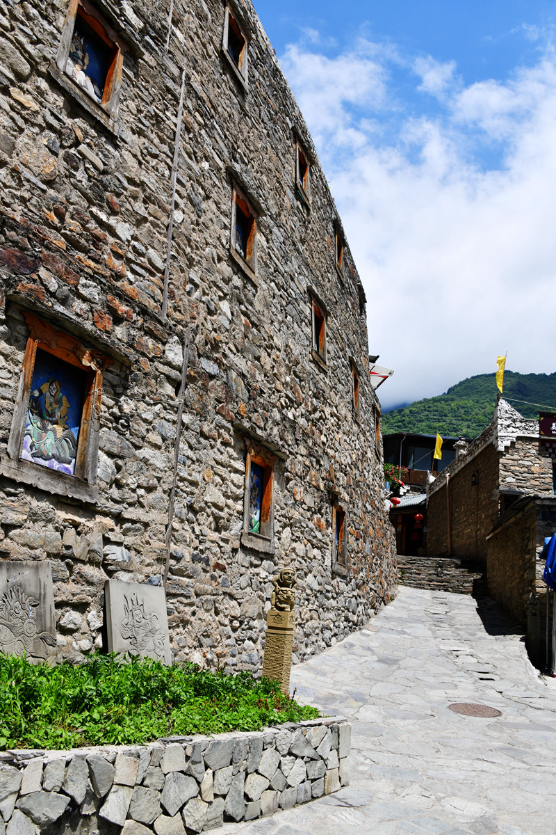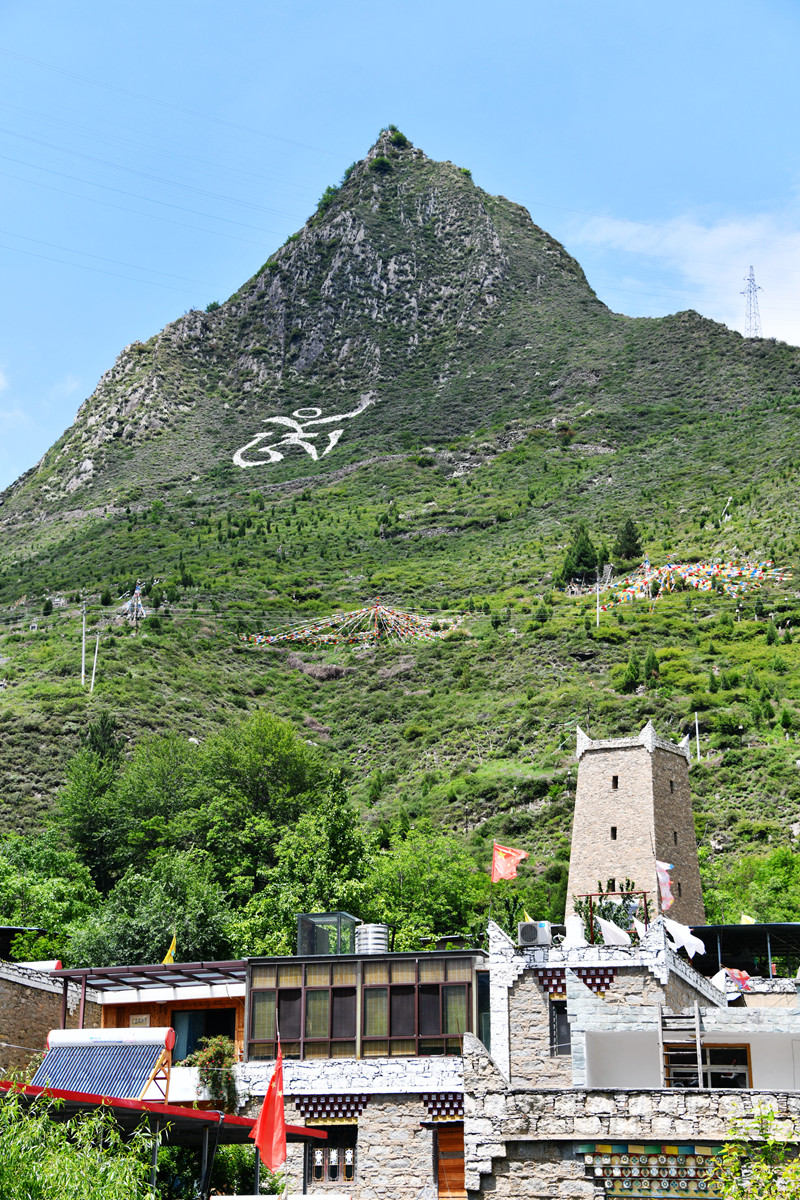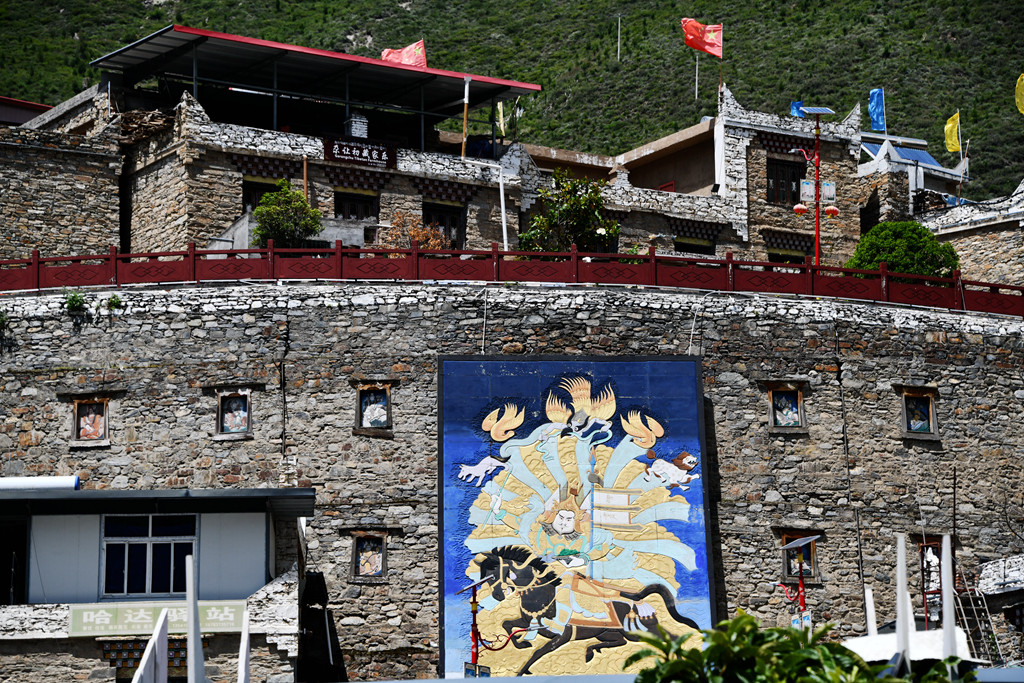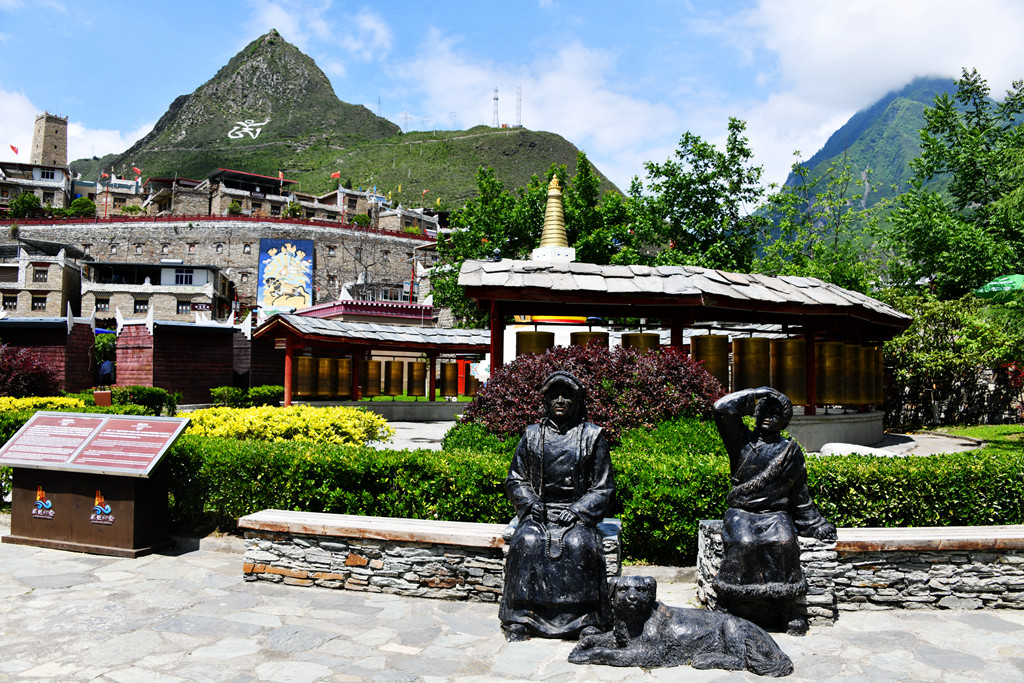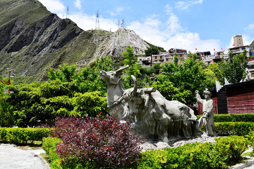 沿着石阶拾级而上,见到一对嘉绒藏族夫妻和一只小狗雕像,守候在转经筒前。先轻轻转动半圆形的转经筒,为我们此行祈福;一尊“二牛抬杠”雕塑,描述了当地用牦牛耕地的特点。抬头正面石壁上,一副巨大的歌颂格萨尔王金箔画像在阳光下闪闪发光;望山顶经幡飞舞,一座碉楼突出于众山房之上。