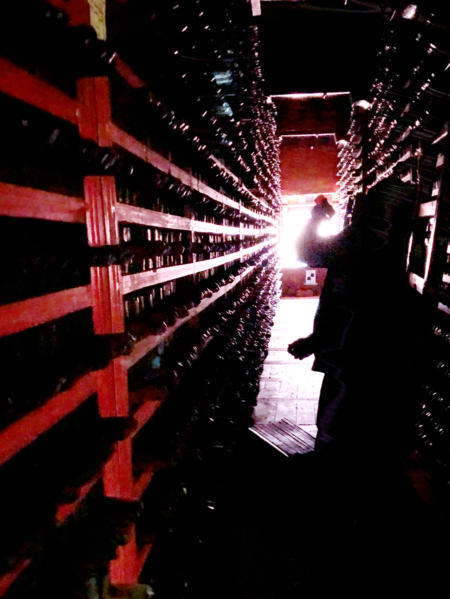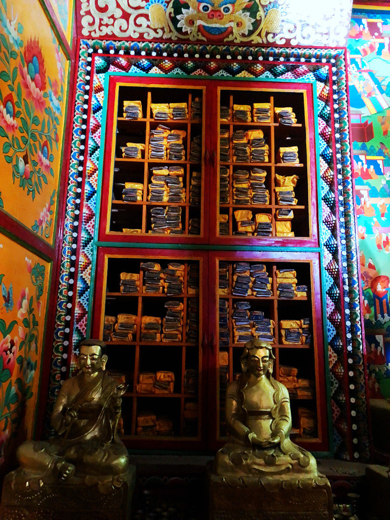 爬着几乎90度的木质楼梯上到二楼,眼前一片黑暗,啥也看不见。短暂的慢适应后,发现这里是一个藏版库,好像图书馆一样,一间间一架架的,放满了印经版,在微弱的光线下,我辨识着那些我永远也不可能看懂不可能理解的经版,一叠叠一摞摞非常整齐地分门别类地插满了版架。每一个长度似乎都一样,细长的经版都有一个手柄。工作人员上下搬动着那些印经版,真佩服,不知道怎么找得到。