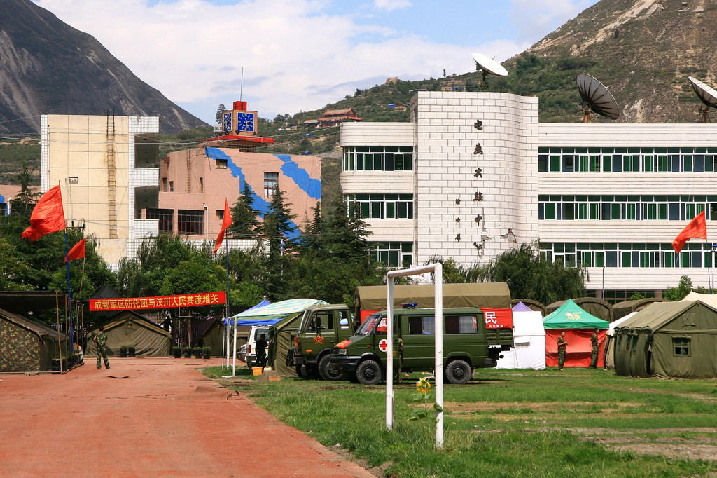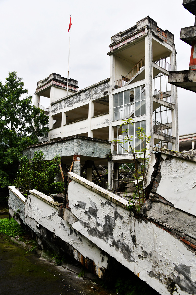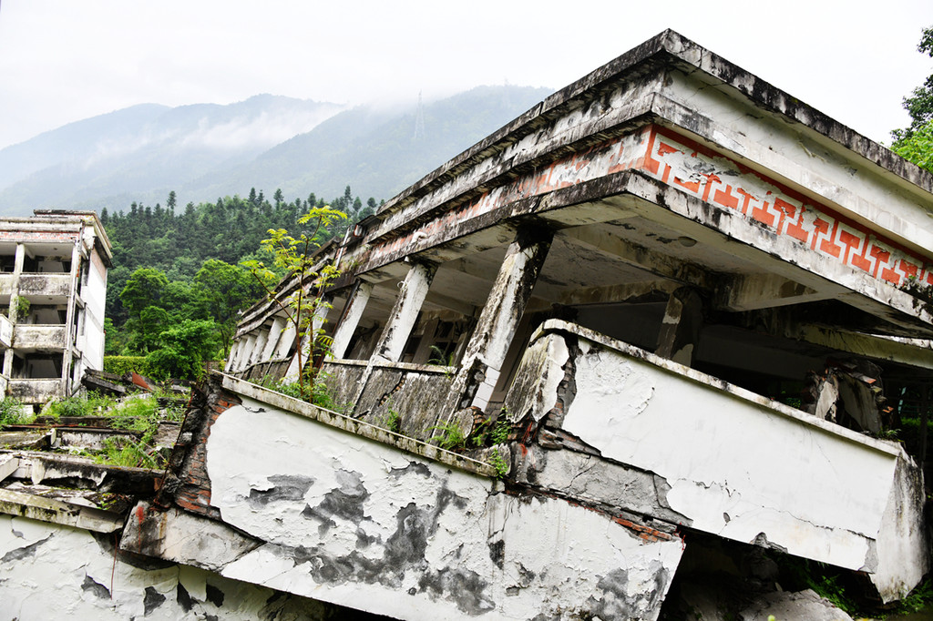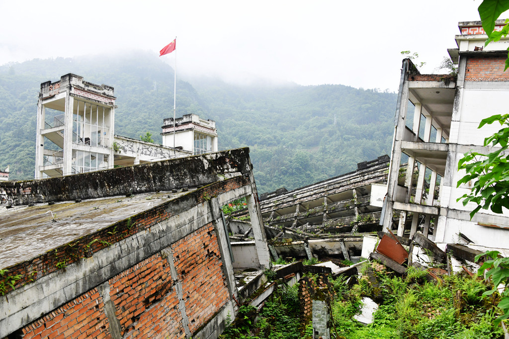 尽毁的校舍目不忍睹,歪歪斜斜,有的全塌,有的半塌,有的裂痕满布墙体。当时那是一个什么样的惨状啊!地震不仅给房屋带来破环,更是夺去了多少宝贵的生命。青山上云雾缭绕,为死去的同胞默哀。逝者已矣,生者当继续前行!
