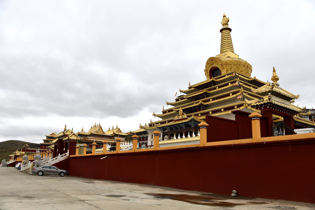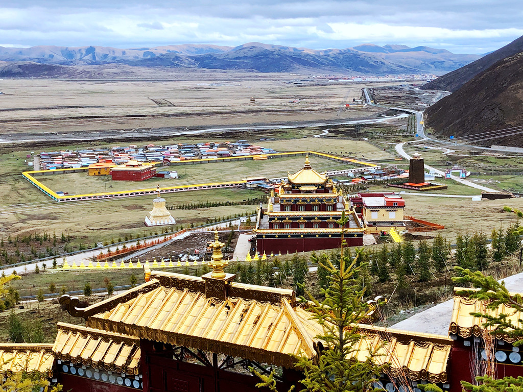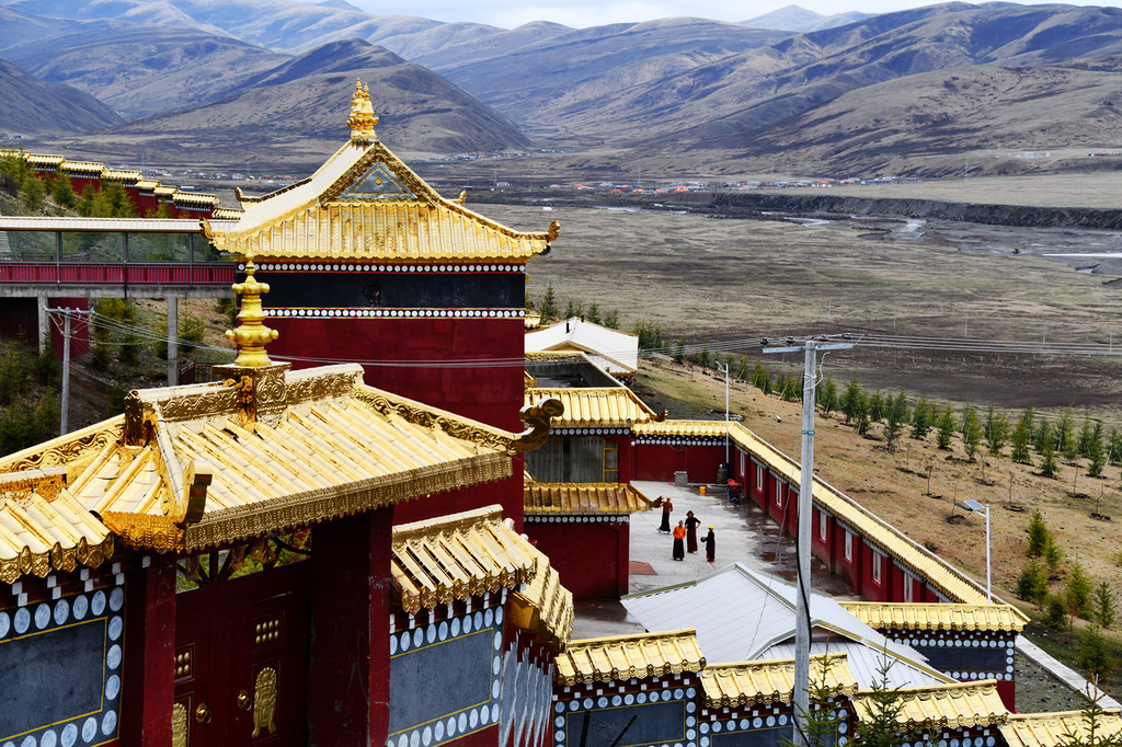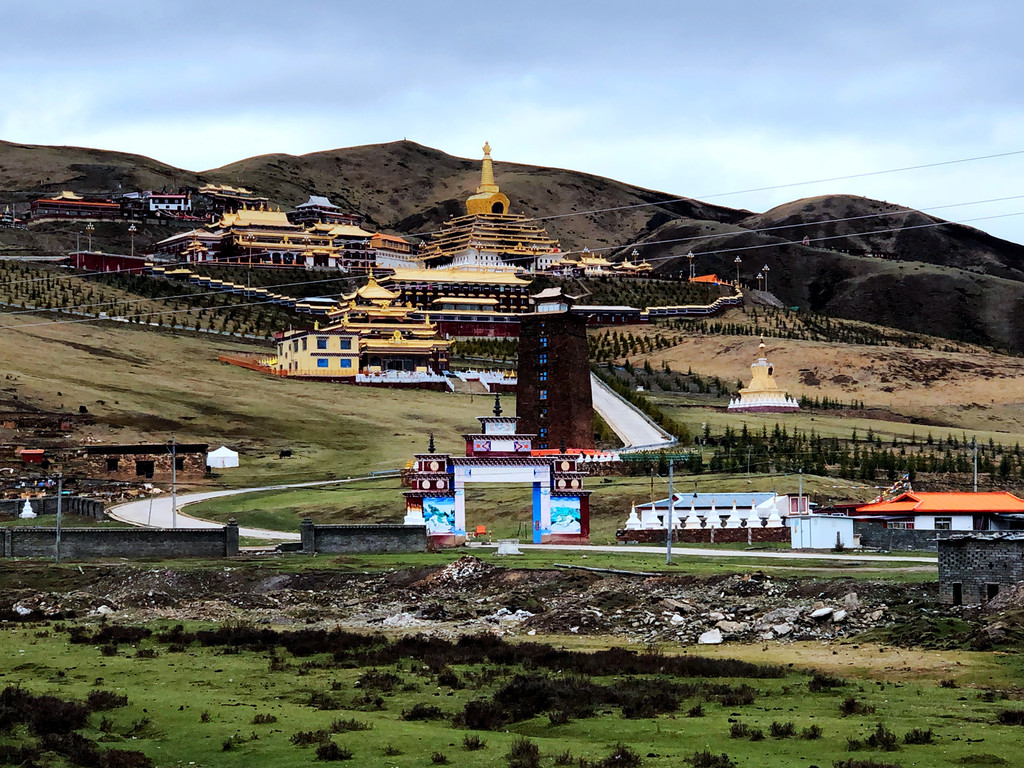 由于事先知道五明佛学院正封闭,备选方案是去东噶寺。东噶寺离色达县就10公里左右,很快就到达了。这又是一座建在山上金碧辉煌的寺庙。寺庙面向一片开阔的草原和山脉,视野非常的好。地面上一个长方形的转经筒围墙装点着草原,夏日时草地上盛开着各种野花,那该是一幅多么美丽的画面。