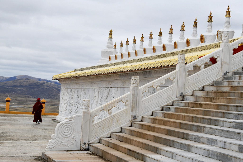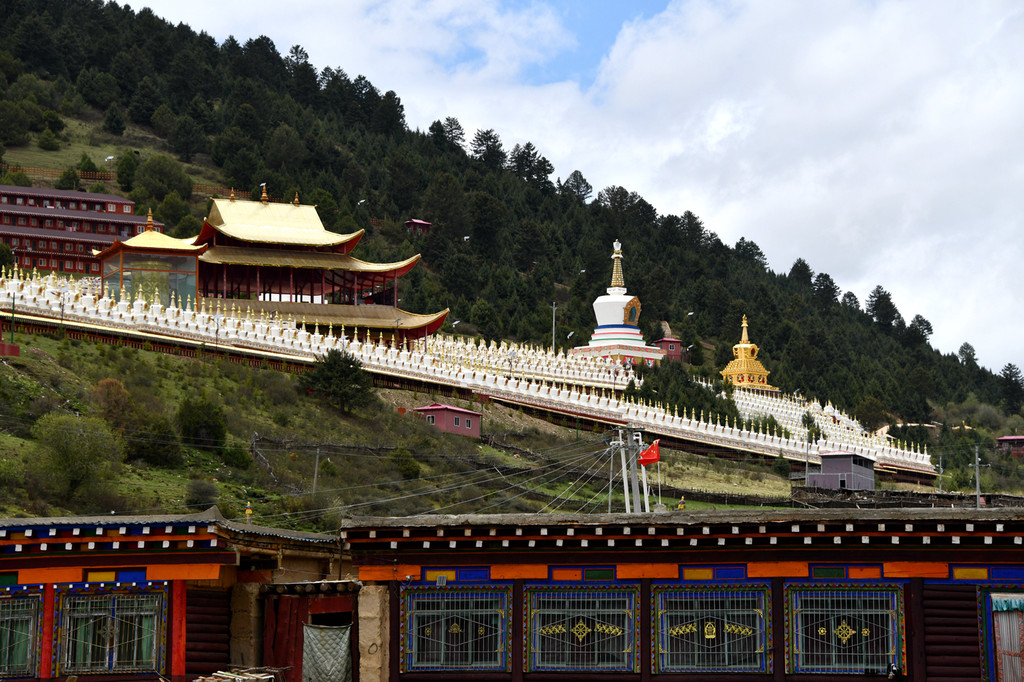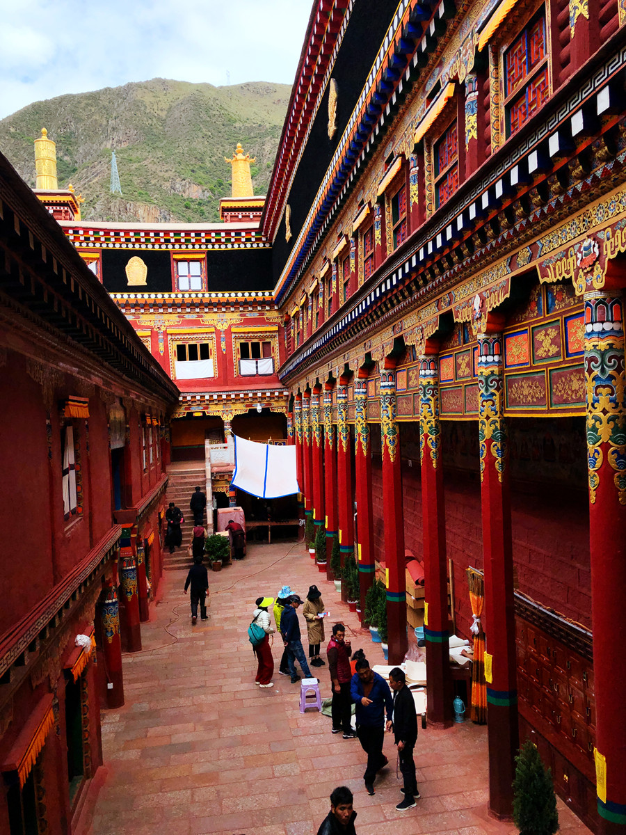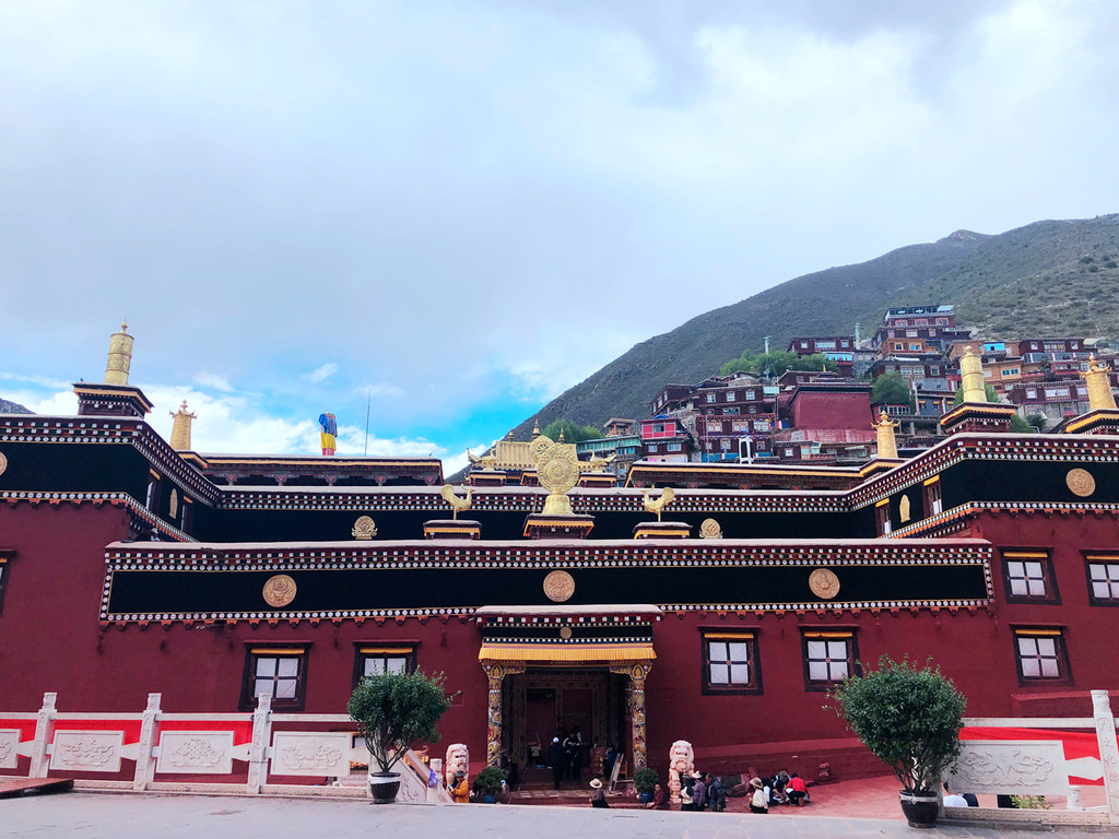 由于事先知道五明佛学院正封闭,备选方案是去东噶寺。东噶寺离色达县就10公里左右,很快就到达了。这又是一座建在山上金碧辉煌的寺庙。寺庙面向一片开阔的草原和山脉,视野非常的好。地面上一个长方形的转经筒围墙装点着草原,夏日时草地上盛开着各种野花,那该是一幅多么美丽的画面。