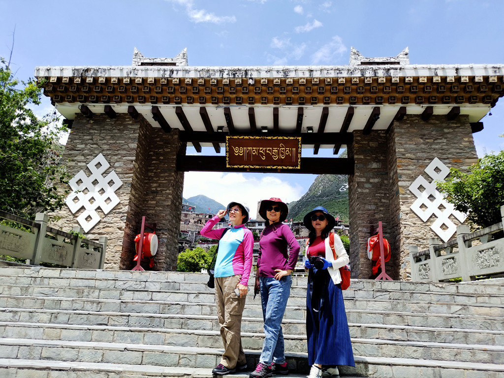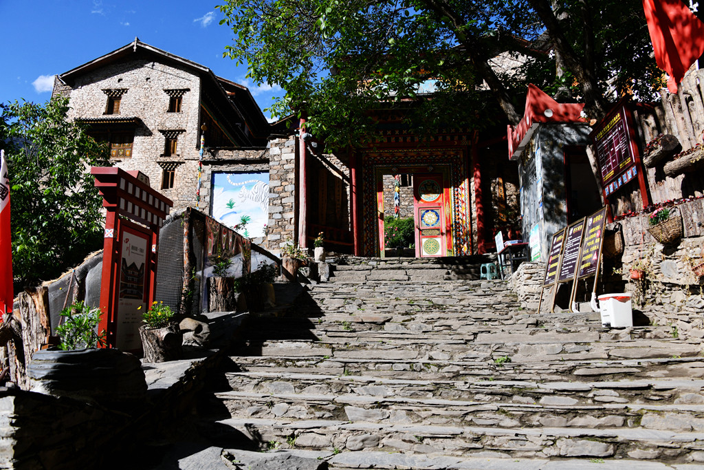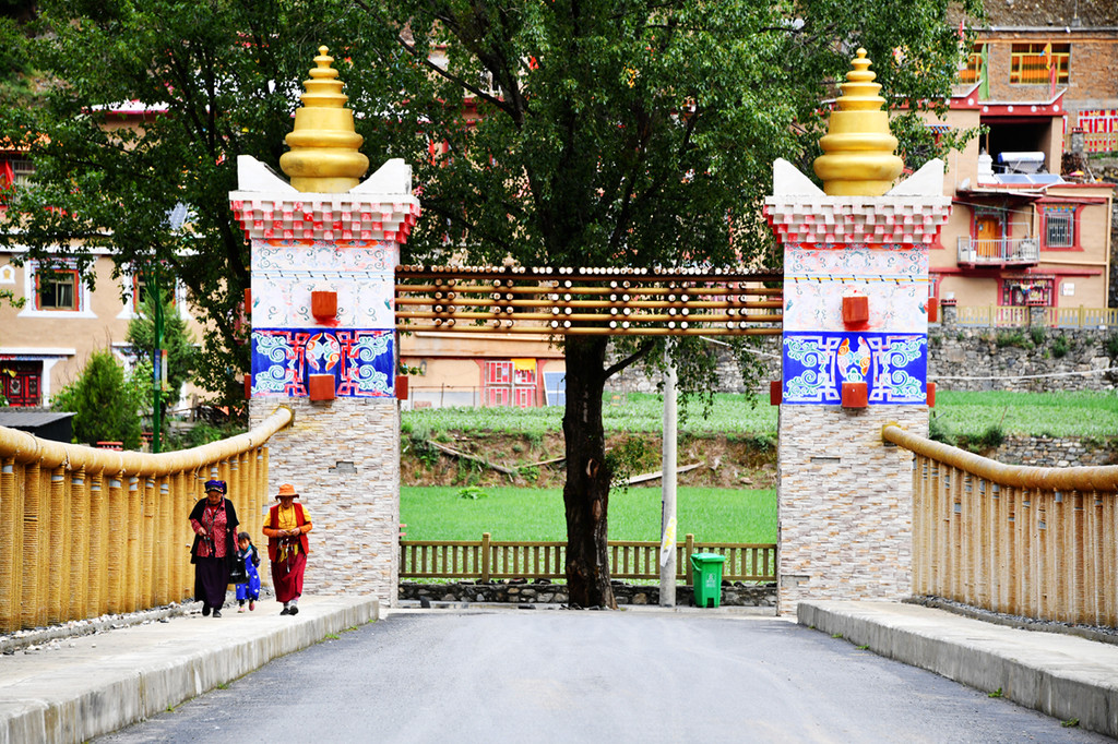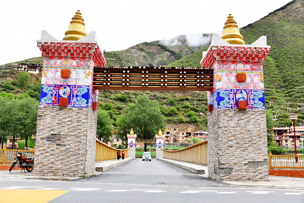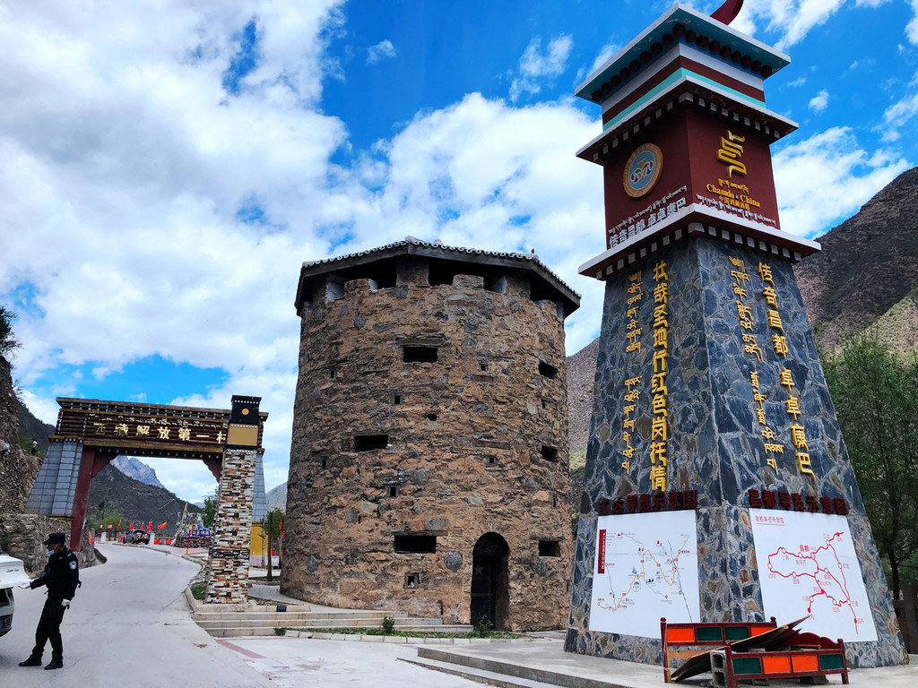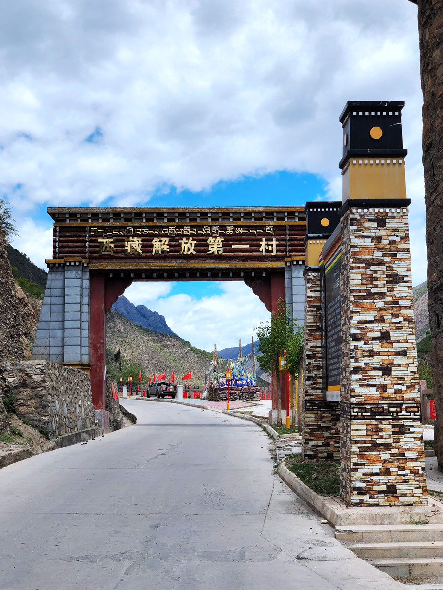 临近村庄,首先映入眼帘的是挂有“西藏解放第一村”牌匾的大门,大门左侧雕刻的是棕红色三面大旗,旗上是十八军进藏、西藏人民欢庆的画面,大门旁屹立不倒的碉楼,似乎在守护着这个升起西藏第一面五星红旗的美丽村庄。所有的一切告诉我,这里是一个有历史有故事的地方。