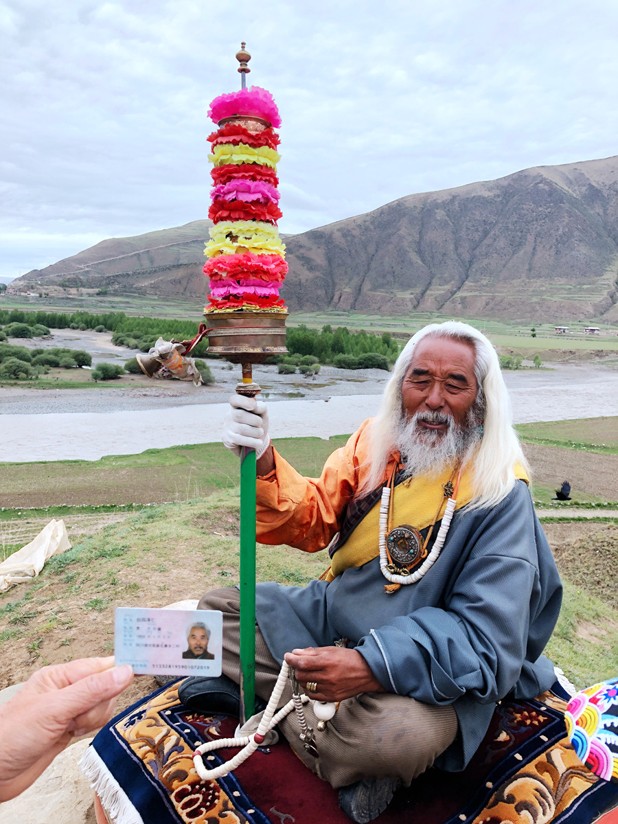 老人姓王,今年63岁,住在附近的村子里,在这里转经已经23年了,除了下大雨下大雪,几乎天天来这里转经,让他的诵经声随着转经筒,飘过雅砻河、飘向更远的雪山。23年的日晒雨淋,老汉脸庞黝黑,身体硬朗,说话爽朗,还拿出他的身份证给我们看。一辈子能做成一件事,而且让大家记住你,真是难能可贵。