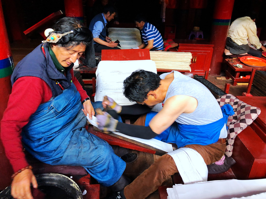 又上了一层楼,眼前立刻亮堂了许多,原来到了印经室。这是一个开放的空间,采光很好。有好几组人正在忙碌着。印刷时,一人来回奔走取送书版,另两人相对而坐,一高一低,书版放于两人之间,一人用擦板蘸墨涂版,一人放纸,用磙筒一滚、揭下,一页书当即印成。有点像过去见的木刻画。