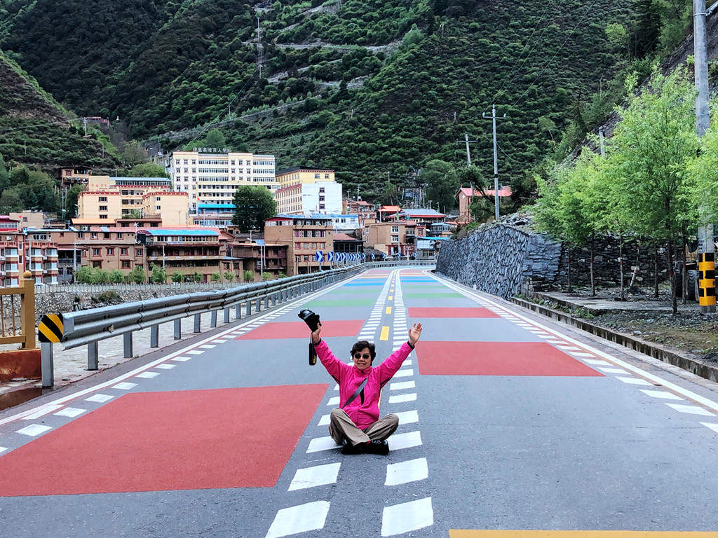 在上寨镇漂亮的一号桥前我们停了下来,这是一座藏式风格的桥,从桥身到桥墩都充满了藏式气息,漂亮的不得了。太喜欢了。正巧遇上两位藏民从桥上走过,给了我一个抓拍的机会。桥外就是五彩的彩虹路,坐在路中央,记录下这美丽的时刻。