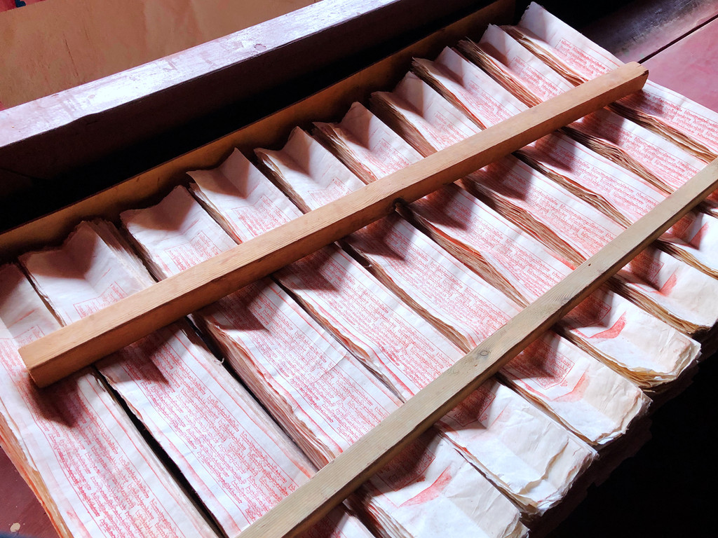 印刷用纸是沿用汉族古老的手工造纸术特制的,韧性强,据说是以狼毒草为原料制作的,因为含有少许毒素,虫不蛀,鼠不咬、久藏不坏。
