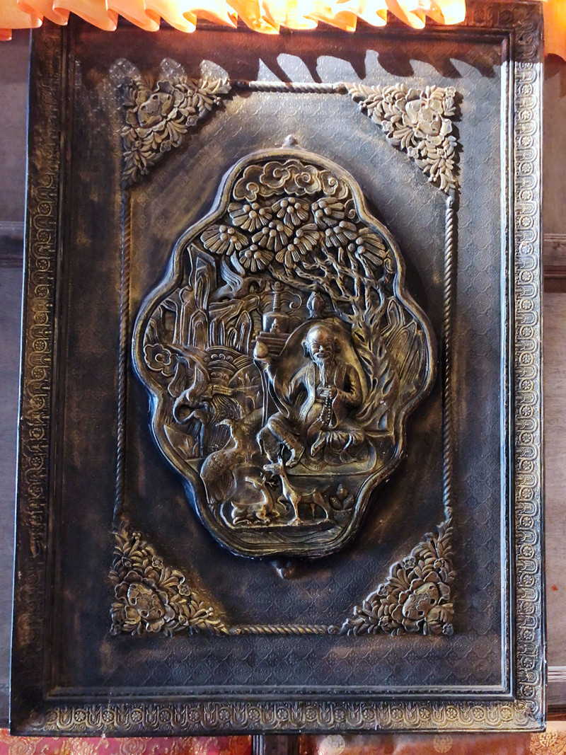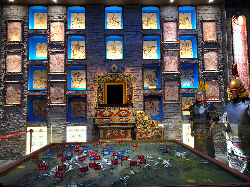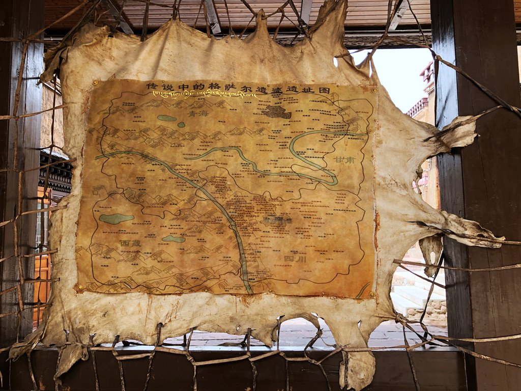 走进大门一眼就看见了一张羊皮地图,描绘传说中格萨尔的遗迹遗址。格萨尔代表着古代藏族民间文化的最高成就,她传承完整,历史悠久,卷帙浩繁,精深博大,规模宏伟,内容丰富。虽说不一定能看懂听懂,但对这古老的藏族文化还是抱有深深的好奇。