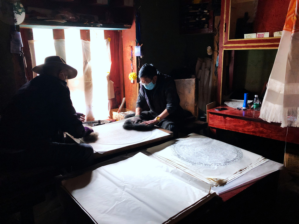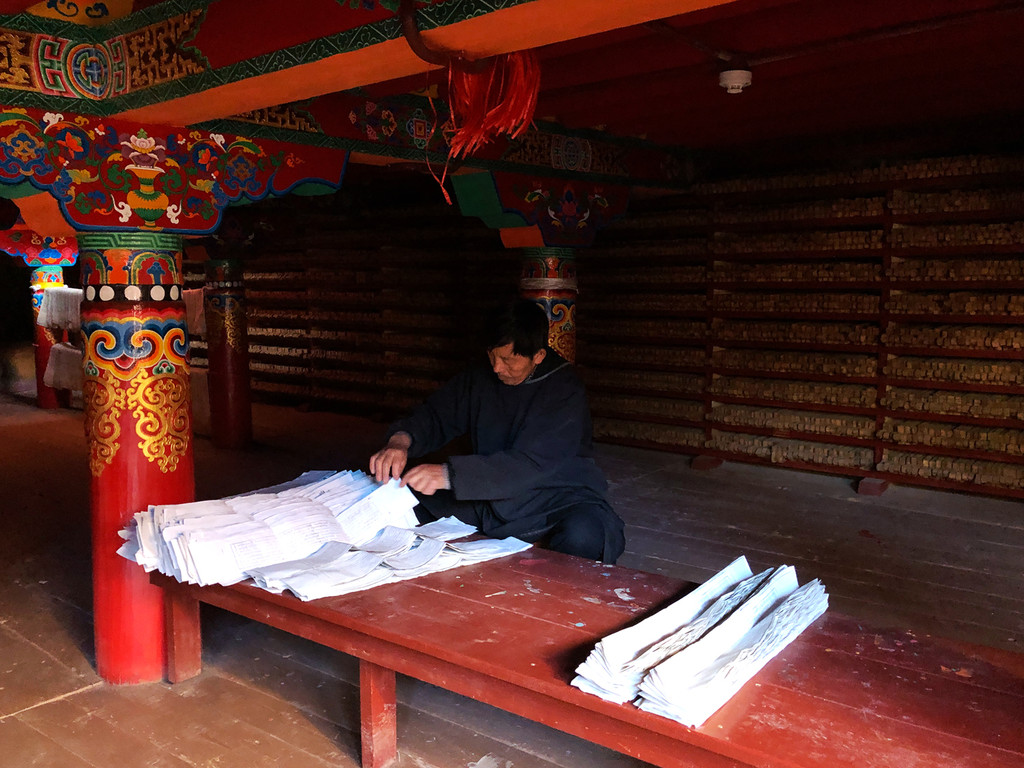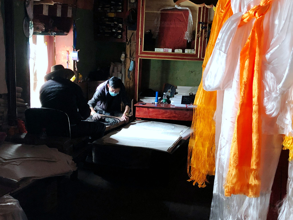 晒经版长廊对面的小屋子,是储藏经画的地方。两位匠人坐在窗前,就着自然光,一幅画一幅画地印着。我看了一会儿想离开,一位匠人突然说:怎么走了?不多看会儿。又留下来和他们聊起来。他告诉我每天要印一千多张画,这些画用在白塔上。一年之间,除了进入冬季11、12月不开工外,每天都在这里工作。他到这里已经20年了。