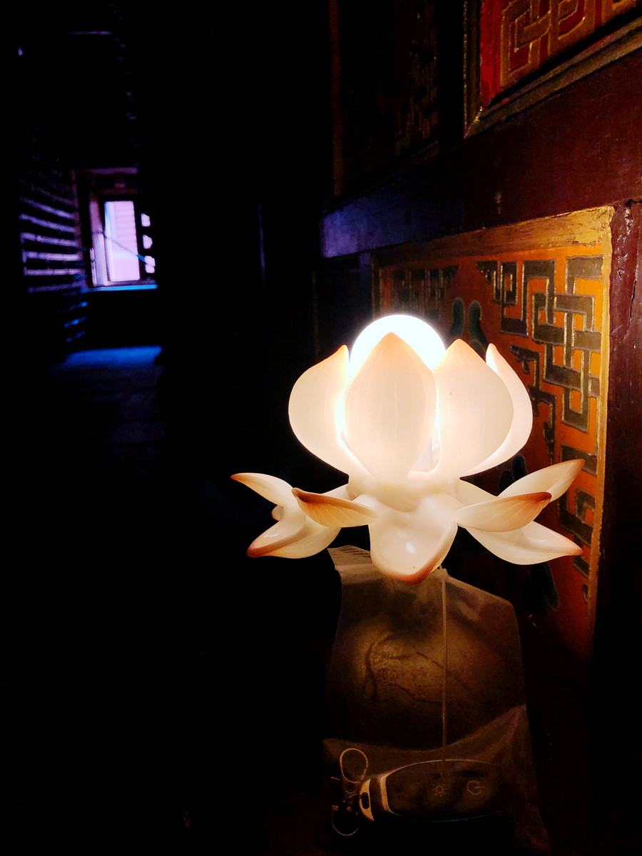 大殿里的建筑装饰,是我去过所有寺庙中最漂亮最辉煌的,那种华丽而又精致的美在别的寺院是没有见过的,难以言表,感觉词穷。我独自一层层地环绕着大殿由低到高,在幽暗的灯光下细细欣赏着大殿里的每一件精美的物件。