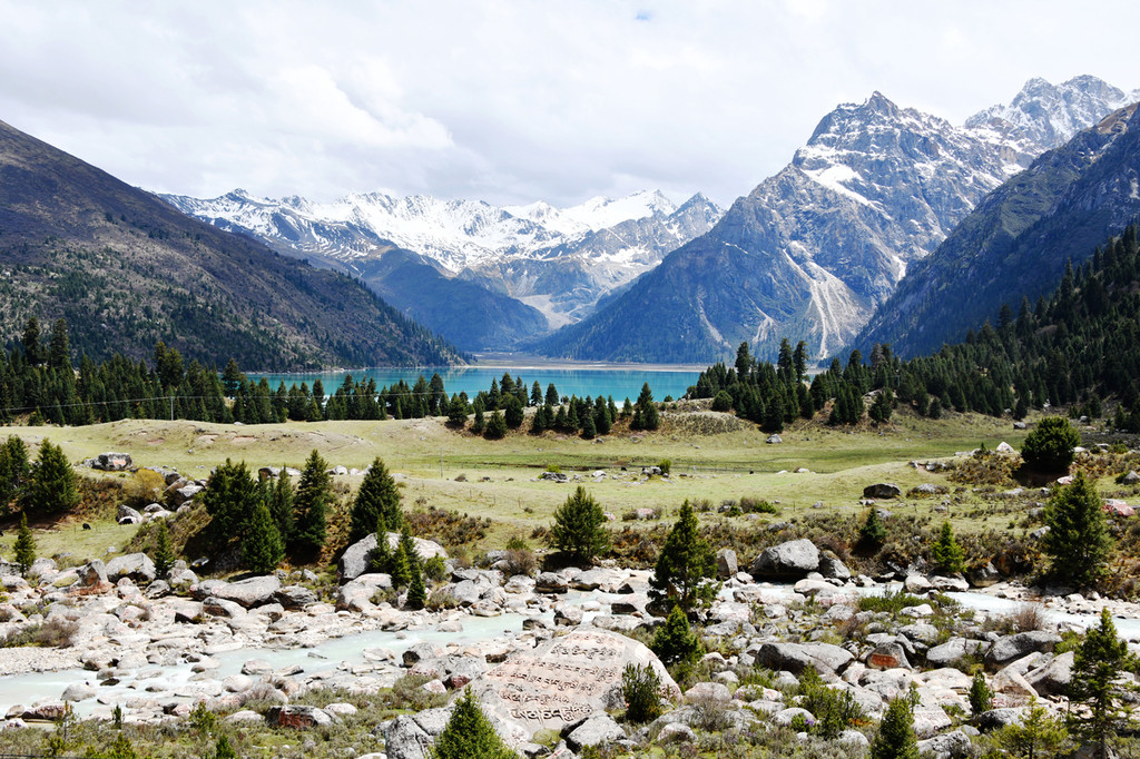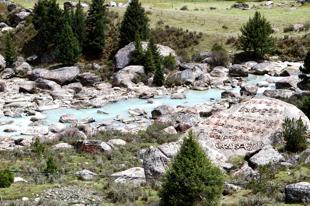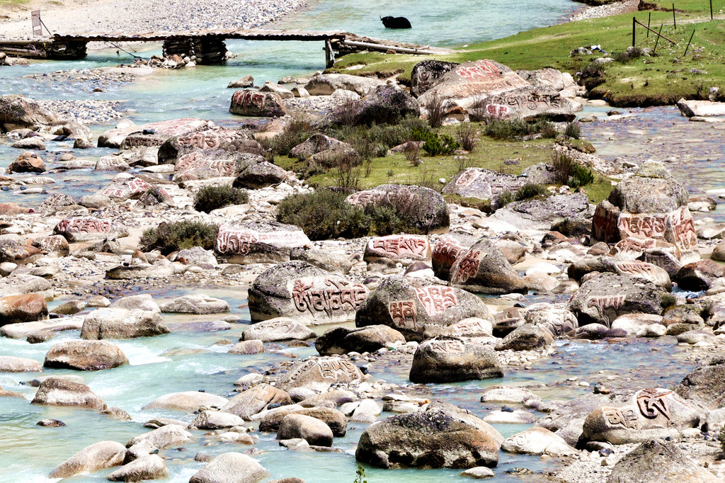 湖外流淌的河水中,大大小小的玛尼石长年累月被河水冲刷着,彩色的图案已慢慢褪色,但藏民心中的祈祷仍随着水流缓缓地流向远方。