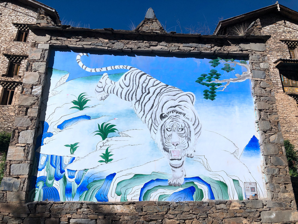 爬一段石阶,来到官寨门前,这是一个具有鲜明特色的寨门,一面画着老虎的屏风位于寨门后。这里有段传说。据说在第一座卓克基土司官寨修建工程即将竣工时,从山上下来一直老虎,它在官寨大门旁卧坐了一天一夜,最后悄然离去。在当地老虎是非常罕见的。因此卓克基这个地名除了本身有顶尖、至高无上的含义外,还有“藏龙卧虎”之地的说法。