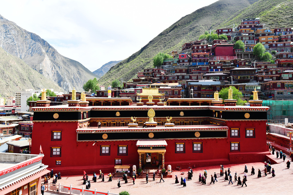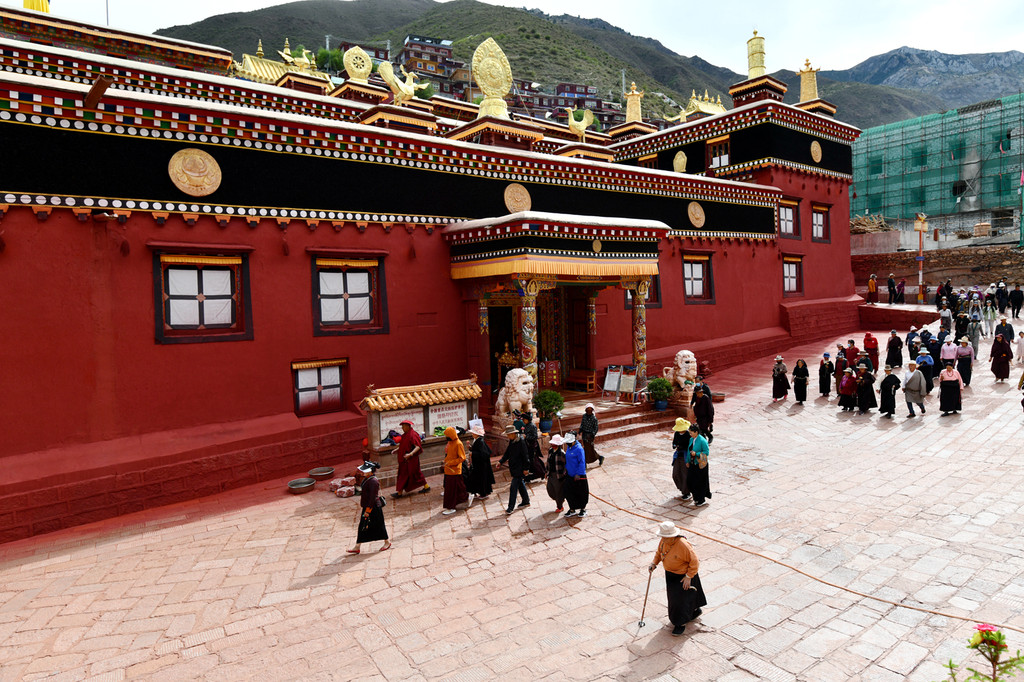 从远处高处凝望着这座朱砂红色建筑,阳光下建筑上的金顶闪闪发光。印经院后山坡上一排排错落有致的红屋子,仿佛把人带到色达。也许,这就是藏族居地区特色。转经的人群络绎不绝,为这座神秘的印经院增加了动感。
