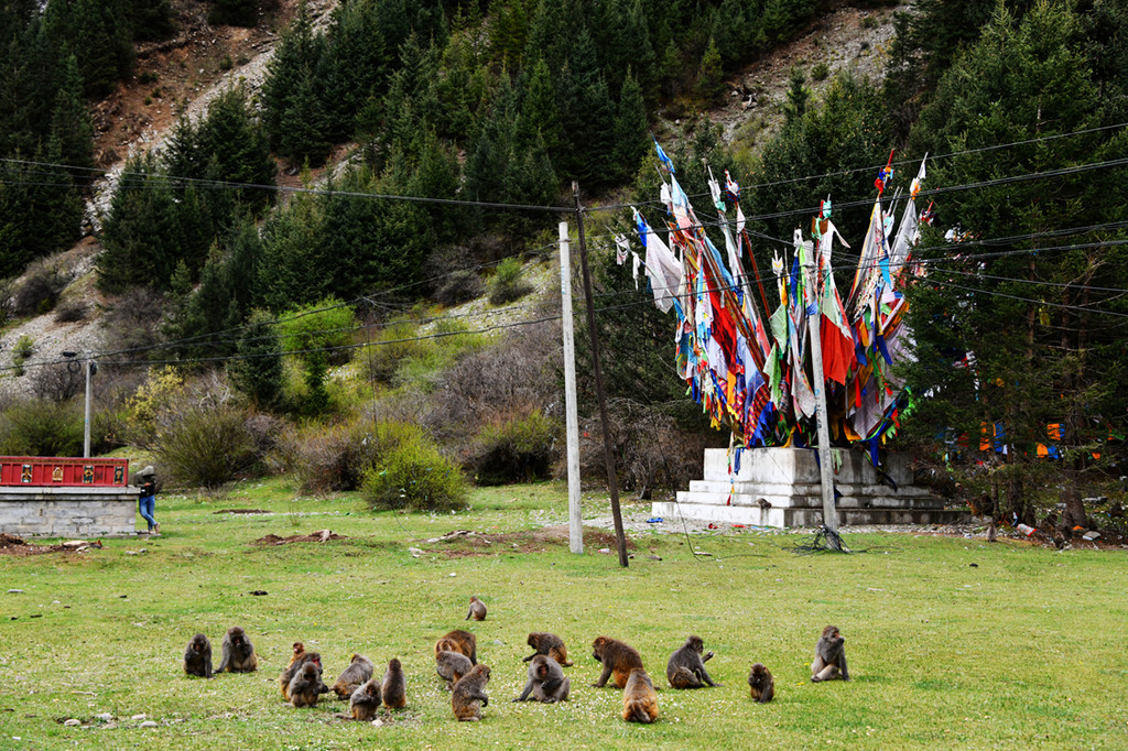 前行不远,看见一个经幡旗堆和一座白塔,在藏区这不是什么稀奇的事,但一群藏猕猴吸引了我们,立刻停车。原来这里是藏猕猴保护观赏区。几十只藏猕猴兴奋地在那里跳跃追逐,几只母猴子带着自己的小猴子从这里跳到那里,小猴子紧紧抱着自己的母亲,绕着母亲钻来钻去。可逗了!一些大猴子则朝我们奔来,对着我们大声叫唤,好像我们侵犯了它们的领地。这群藏猕猴太有意思了。