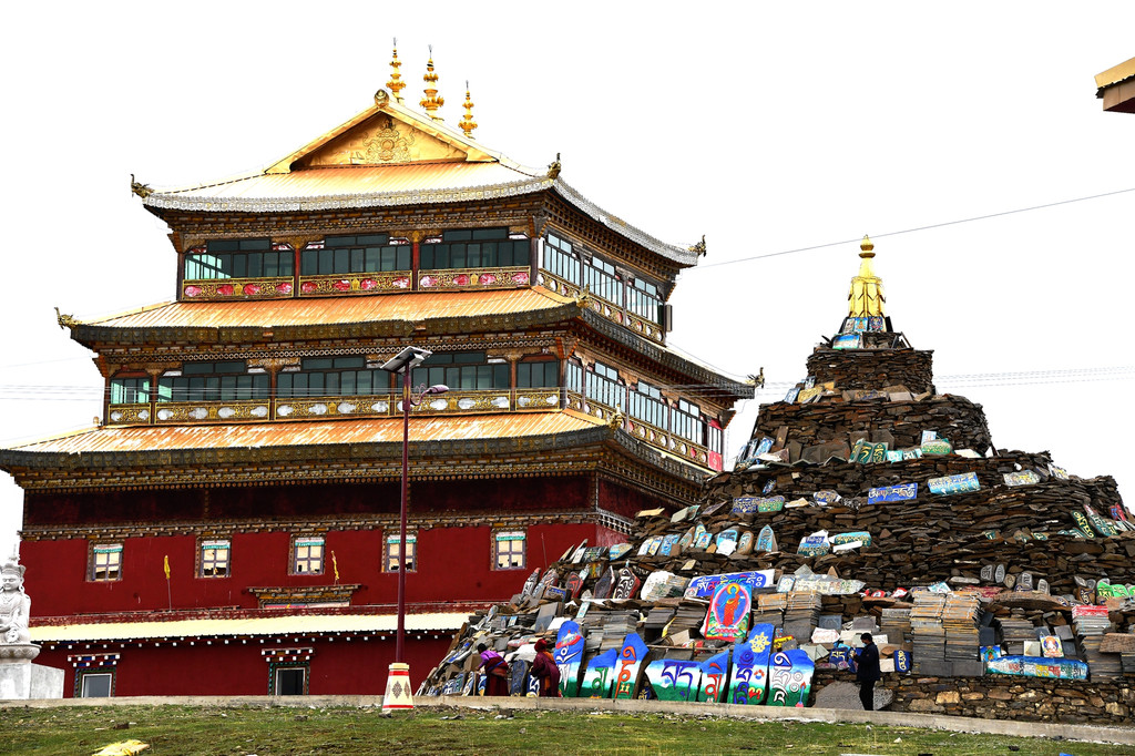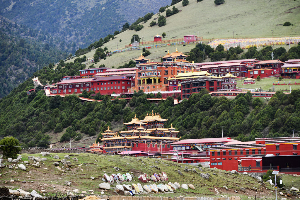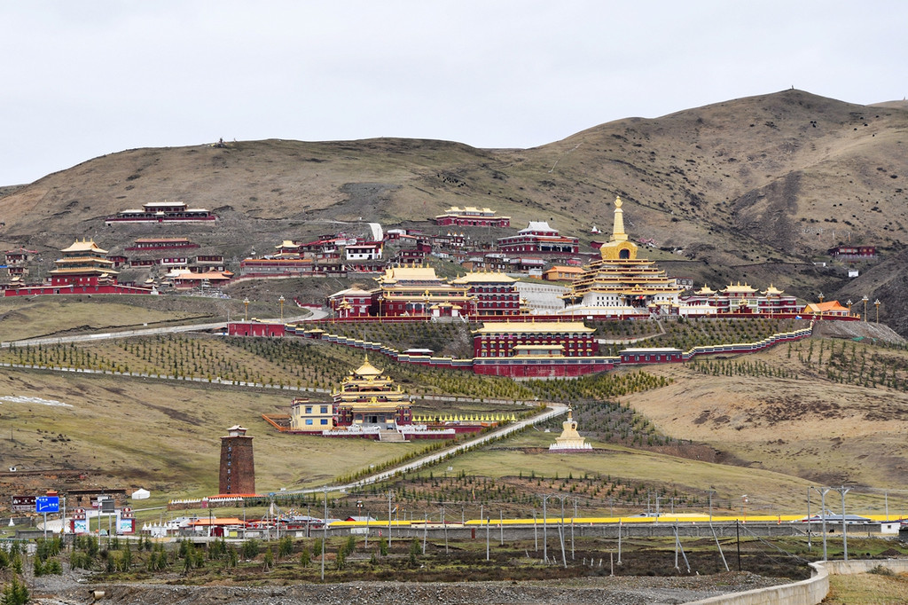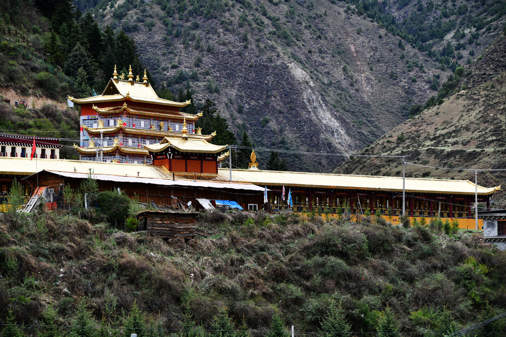 途中经过一片颇具规模的寺庙建筑,依山而建,红墙金顶,气势非凡。只知道这里属于甘孜自治州,但不知道这是什么地方?是什么寺?
