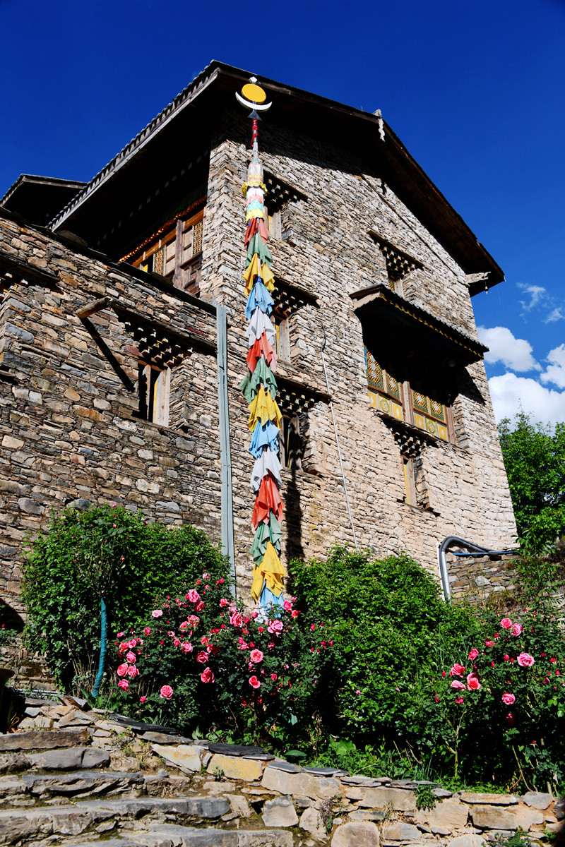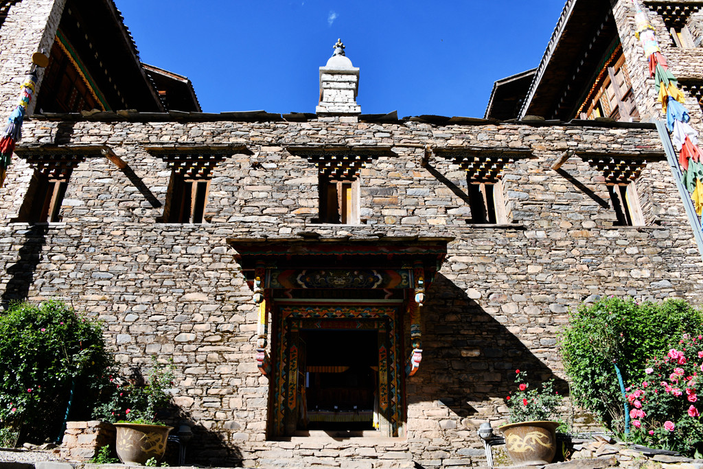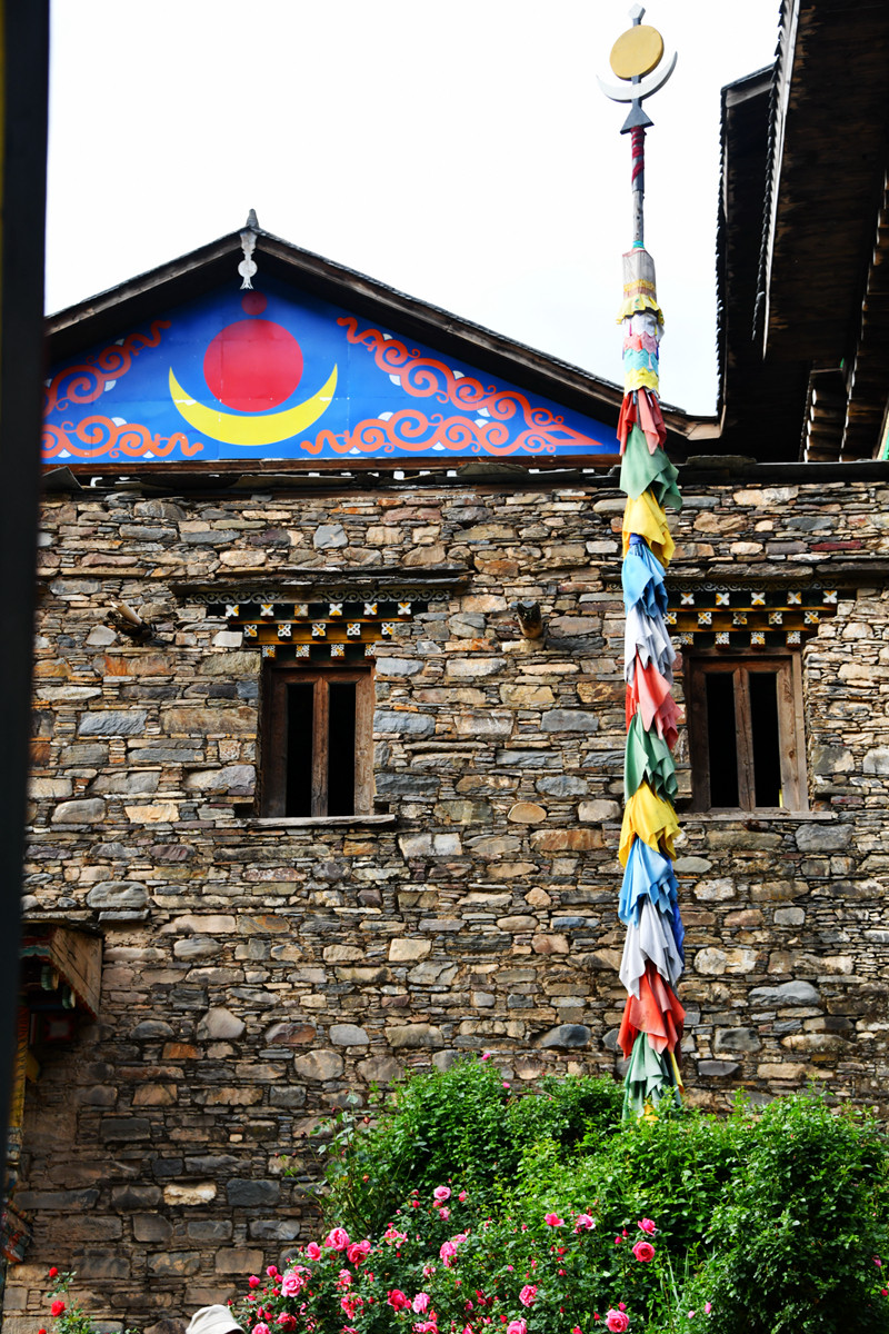 门前一面藏式高大旗杆,顶部配以日月气托,旗杆上一长幅嘛呢经幡在风中威风十足地飘动,以抵御一切邪秽之气的侵犯。