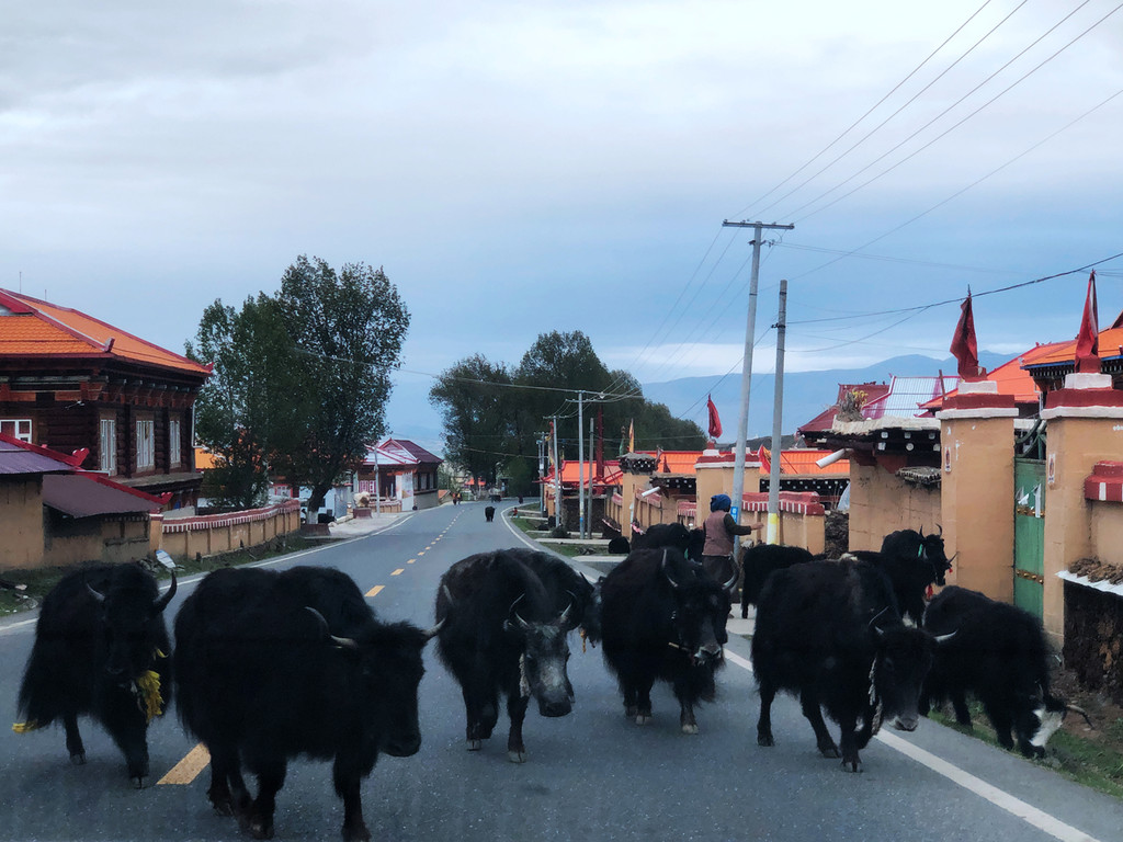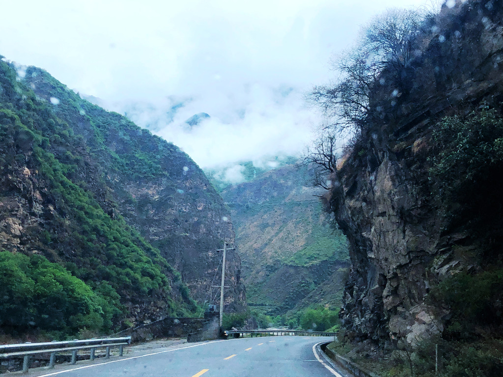 又出发了。沿着成那线青山绿水行走317真是一大愉悦,昨夜的雨让两侧青山更加郁郁葱葱,卓斯甲河在一旁欢快奔腾跳跃着。远处山脉时不时出现白色的云雾,山边一座座藏式民居不断闪现。偶尔可见刷成不同颜色的路面,那就是彩虹路了。