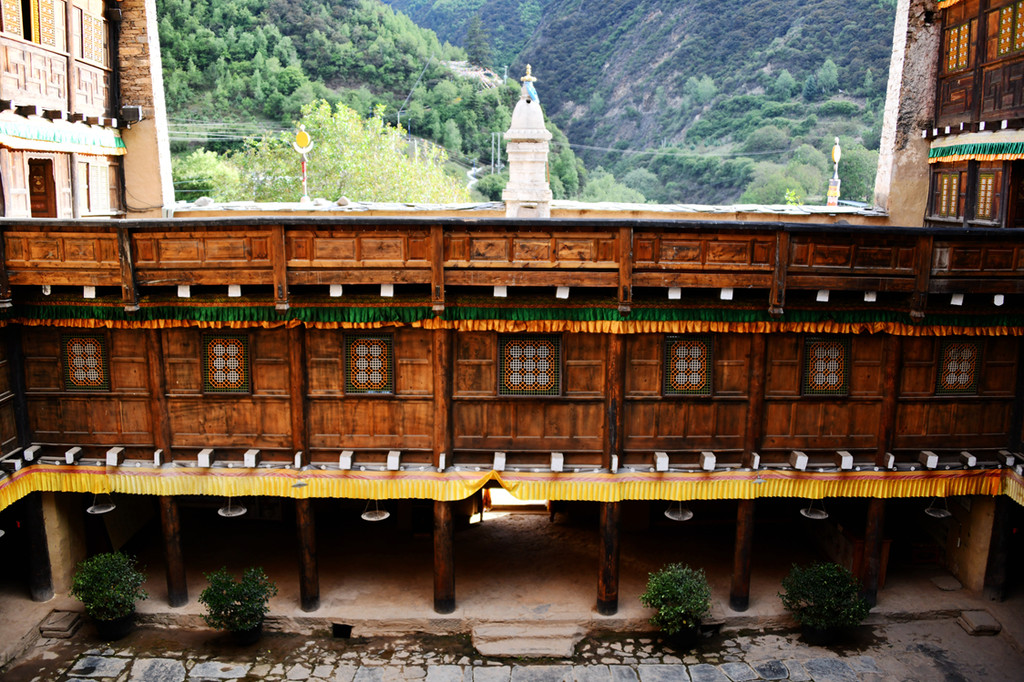 这是仿汉式四合院结构,北部正屋为假六层,东西厢房为五层,中为天井,共有大小房间63间。站在天井的坝子上,仰望每一面楼层,生出一种威严阴森的感觉!一楼主要是嘉绒文化,二楼主要是红色文化,三楼展示土司文化,四楼展示宗教文化。