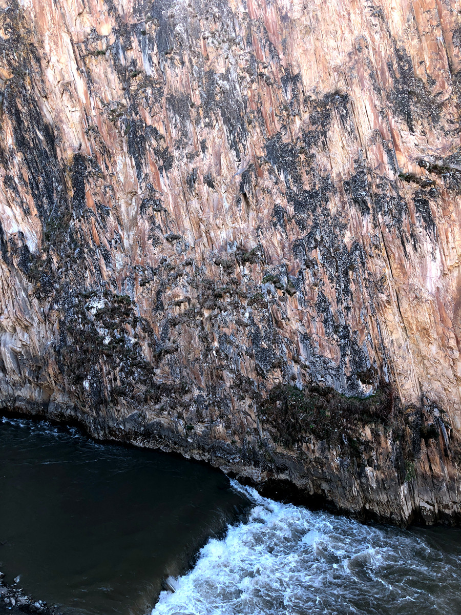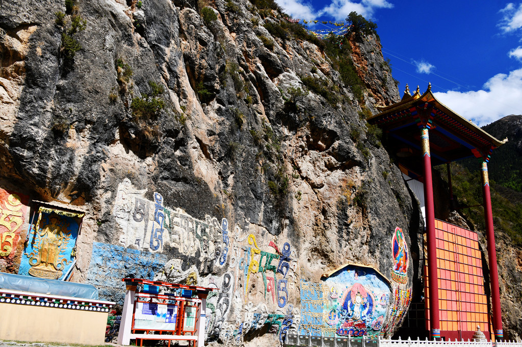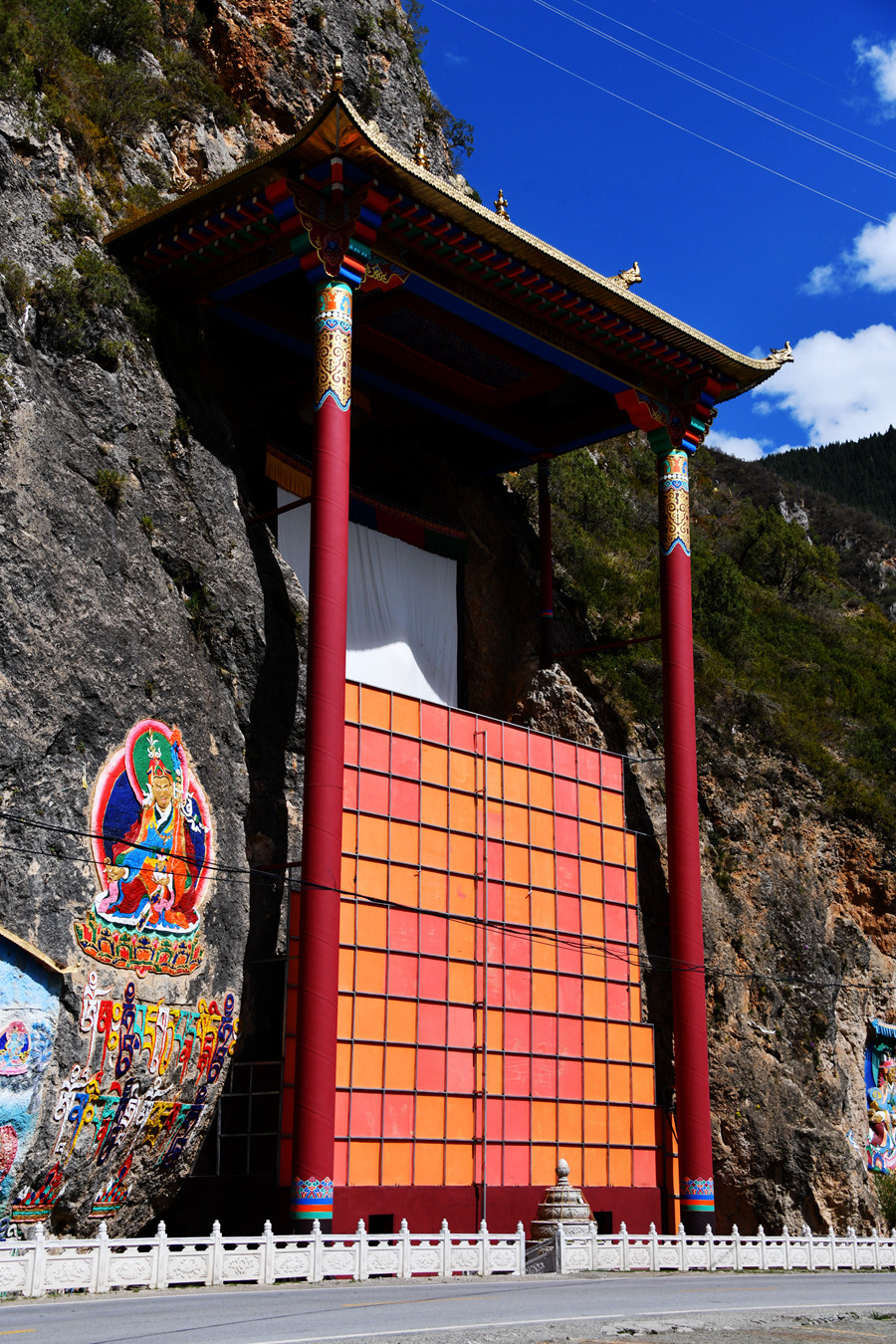 继续前行,一个旅游景区的指示牌告诉我们应该进入了甘孜的德格。这里可能是小众景区,因为车导也说不清楚这里是什么地方。指示牌标识着:达马洞观景台、博纳大佛塔、释迦摩尼像。这是一个峡谷,一个很奇特的佛建筑高高地矗立在一侧的山峰边上,两条长长的绛红色的柱子一直伸到崖顶,撑起了金碧辉煌的屋顶。岩壁崁着几幅雕刻绘画精美的佛像。
