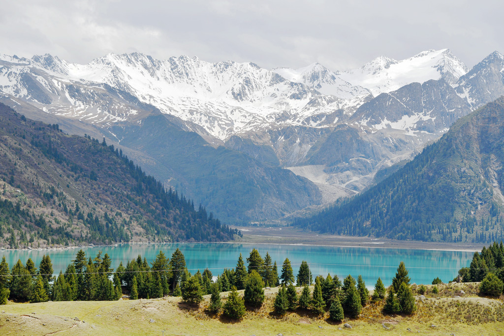 新路海因为维修关闭没进去,在路边远远的拍了几张。这是我们这一路走来遇上的唯一一个湖泊,远看雪山下的那片湖水蔚蓝,被绿色松柏环绕着,非常的漂亮,有点新疆天山的味道。
