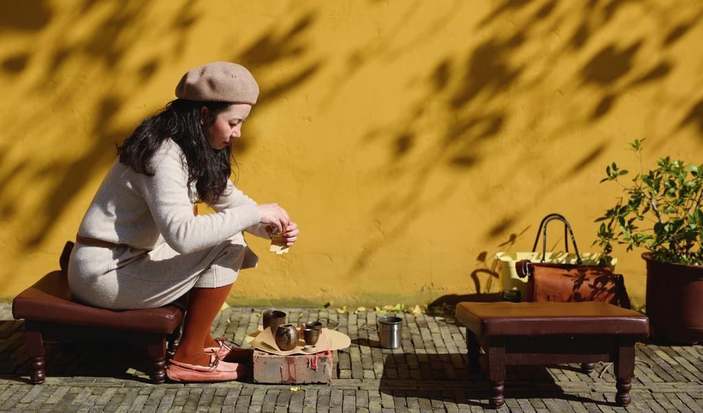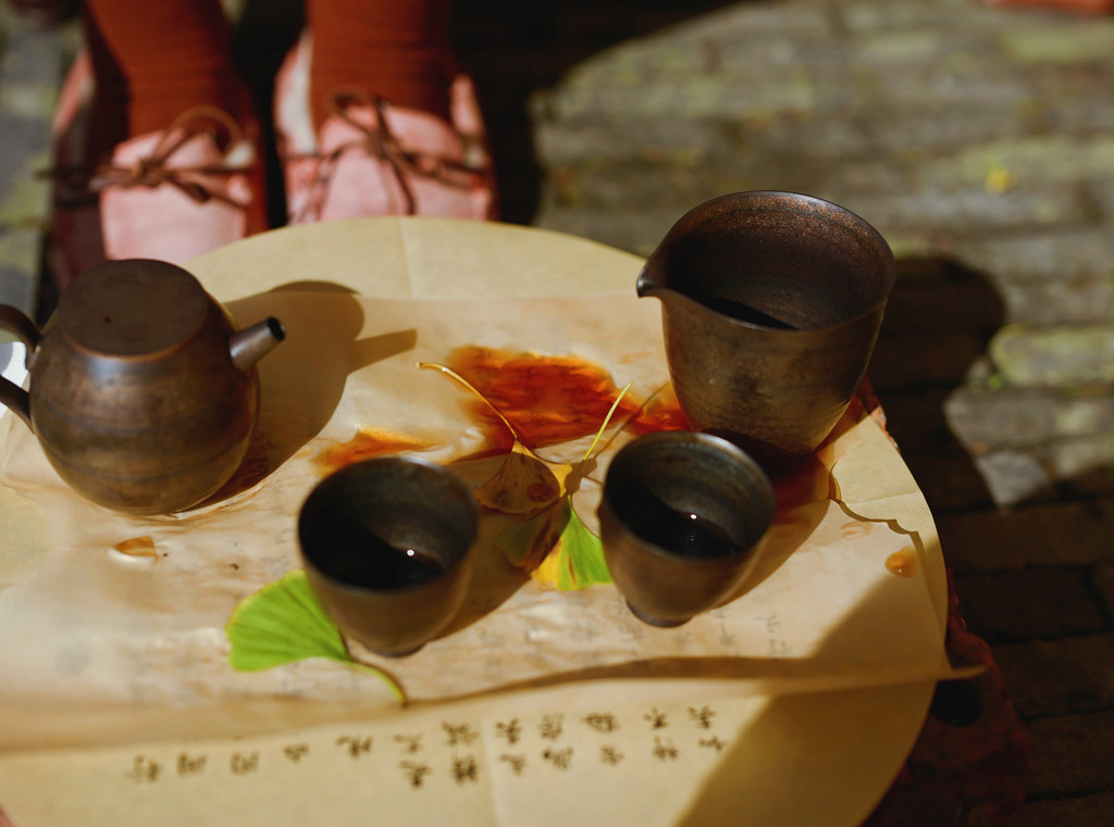 向工作人员借了小凳,用庙里残留烛蜡的砖当茶桌;练习的毛笔字做茶席;拿出自带的茶具、茶——辛丑年经典熟普,体会陈料的魅力。