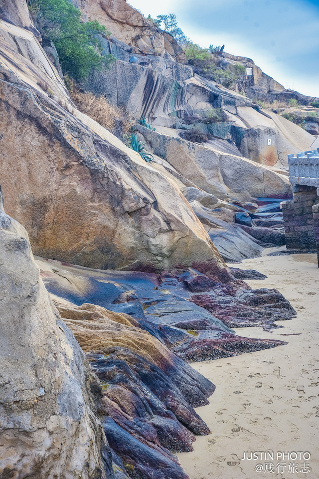 另外一个鼓声洞,据说是由海浪千百年来冲击形成的风化岩洞,长度不及笔山洞,一分钟不到就可以走完。比起笔山洞,鼓声洞是鲜少听说的,可能由于它的位置离三丘田码头和繁华的龙头路都相对较远,如果只来一天游玩,许多游客不会选择这里。