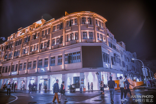 鸦片战争后,许多从南洋回来到厦门从商的闽南人来到中山路一带兴建骑楼,于是就有了这种上住下铺的建筑形式,也算是以前的“商住合一”了。骑楼最大的好处,就是能遮阳挡雨,晚上刚好下雨,骑楼的作用立竿见影,路上的行人都纷纷进去躲雨了,哈哈。