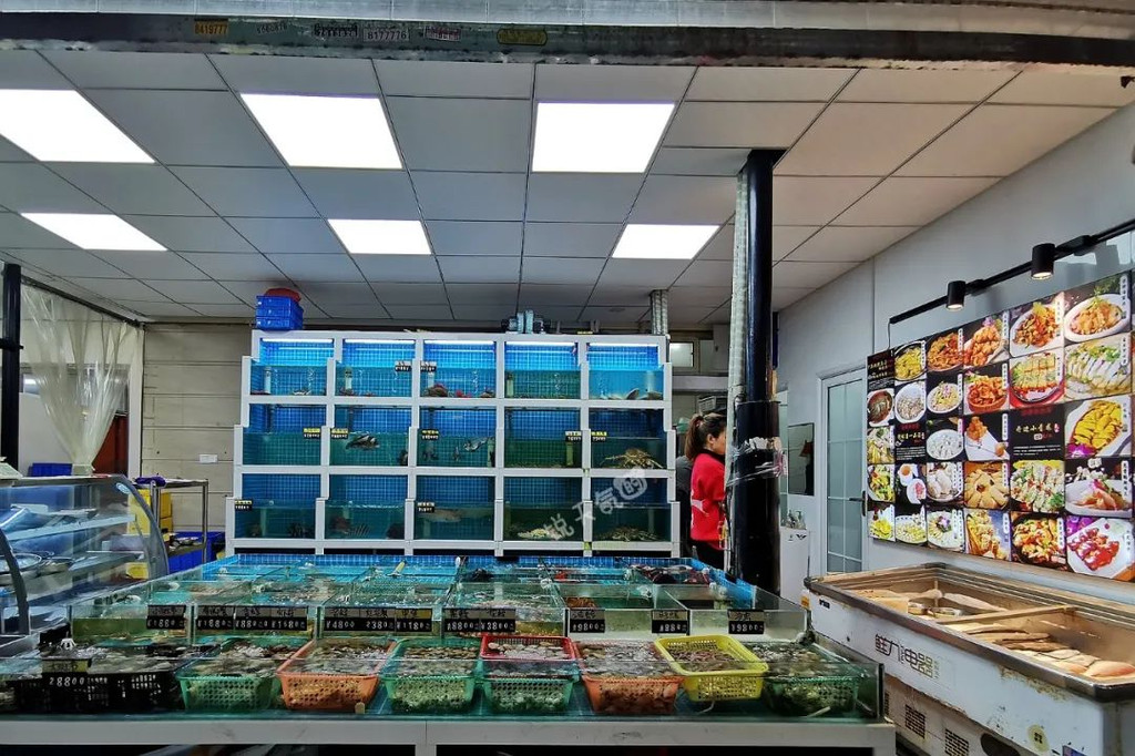海鲜池很大,鱼虾蟹贝,生猛海鲜,品类繁多,还有图片菜单,看着点菜简单直观。店前有个不大的明档,主要烹饪盐水炝午鱼和黄椒焗鱿鱼,都是招牌菜,点单率很高。