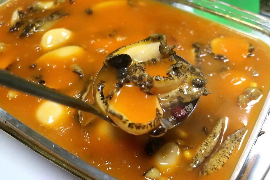 杂粮煮鲍鱼,鲍鱼已切成薄片,浓郁的鲍汁里,有炖得酥软的野米、红豆等杂粮,一口软嫩,一口香醇。