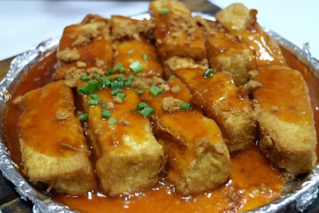 鲍汁豆腐,煎过的蛋豆腐,淋上香浓的鲍汁,还撒了肉松和葱花,软嫩非常,咸鲜入味。