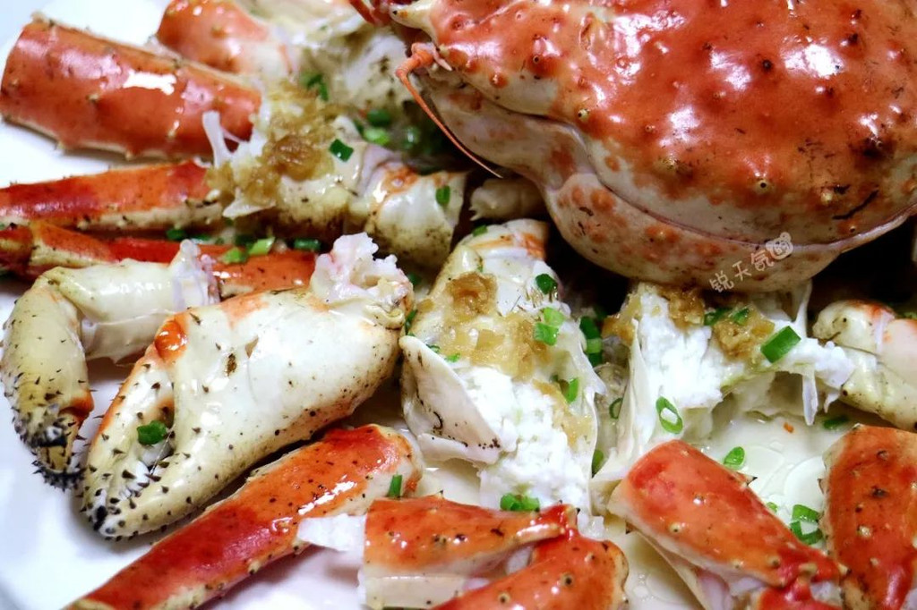 六斤重的帝王蟹,不是冰鲜,而是活鲜,从海鲜池里现抓现杀,清蒸是最恰当的烹饪方法,蒜蓉有去腥添香的作用。鲜活的帝王蟹肉,饱满、紧致,每一口都是满足!