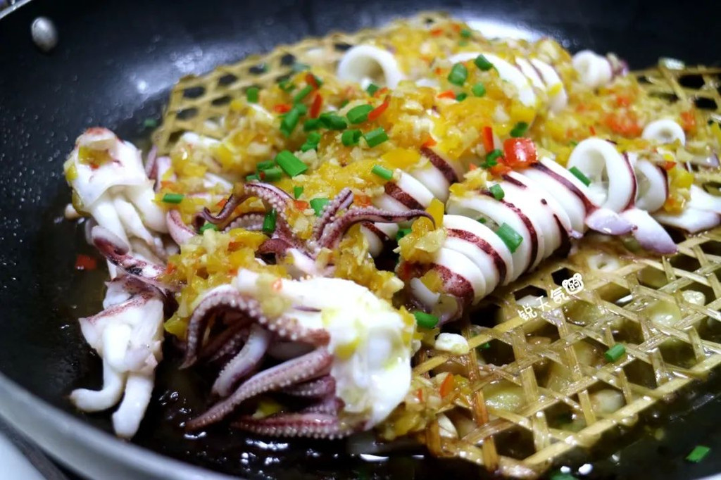 黄椒焗鱿鱼,新鲜的鱿鱼质地弹牙,与带着特殊果香的黄椒相得益彰,趁着热气吃一块,辣爽辣爽的。