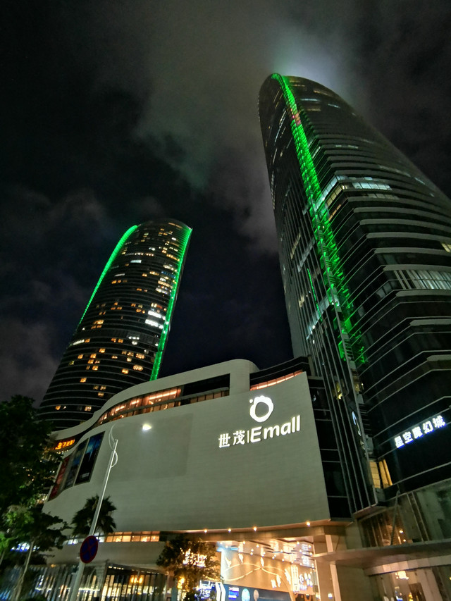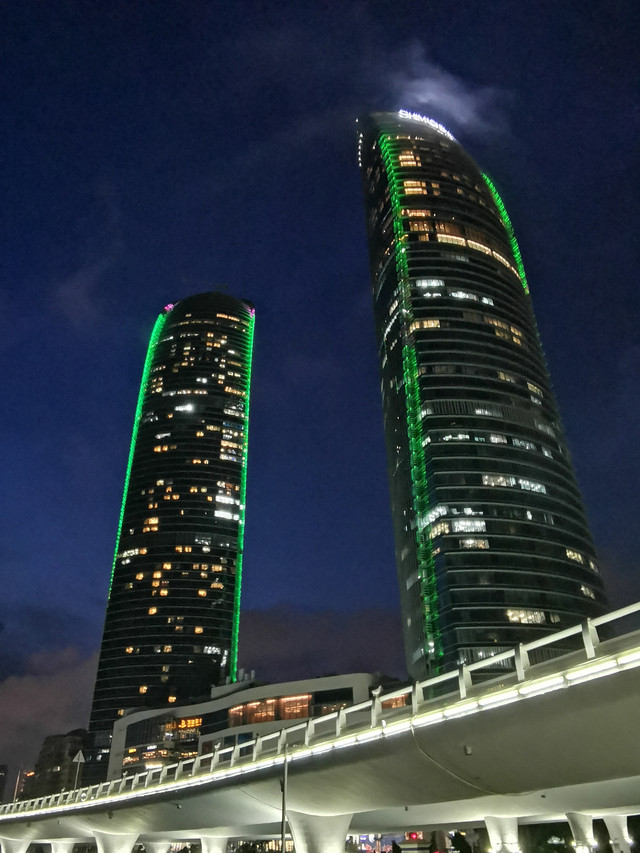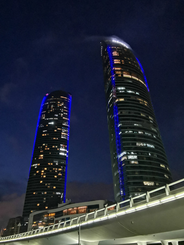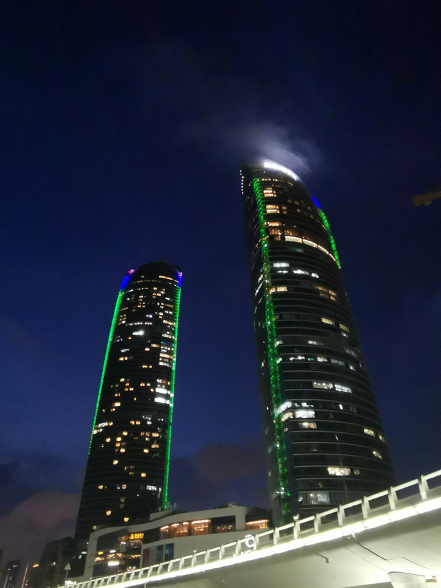 夜色中,灯光色调不断变幻的大厦双子塔。
