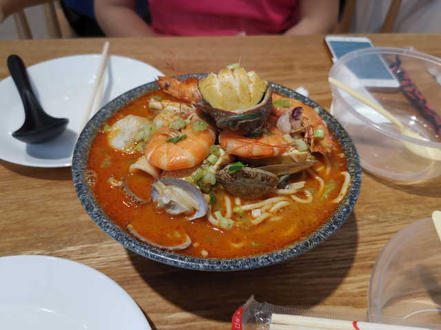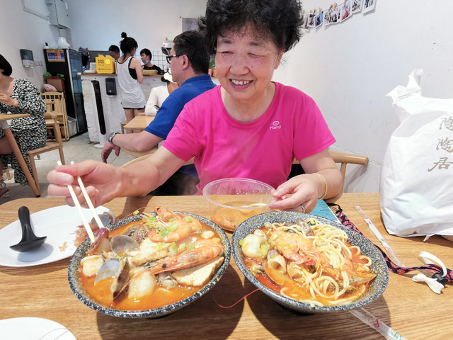 “好店不怕巷子深”,我们在曾厝峖曲折的小巷里一路寻觅,终于找到了这家口碑不错的沙茶面馆。餐馆由几位开朗活泼的年青人打理,就餐的大都是“回头客”。我们点了一份鲍鱼沙茶面(40元)+一份海鲜沙茶面(30元)。看看眼前这新鲜、这份量,这就是地道的厦门沙茶面,这小小的门店里不仅有美味,还有愉悦和称赞!
