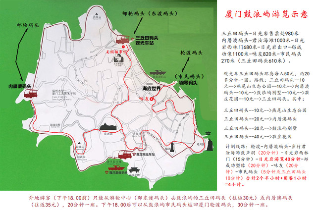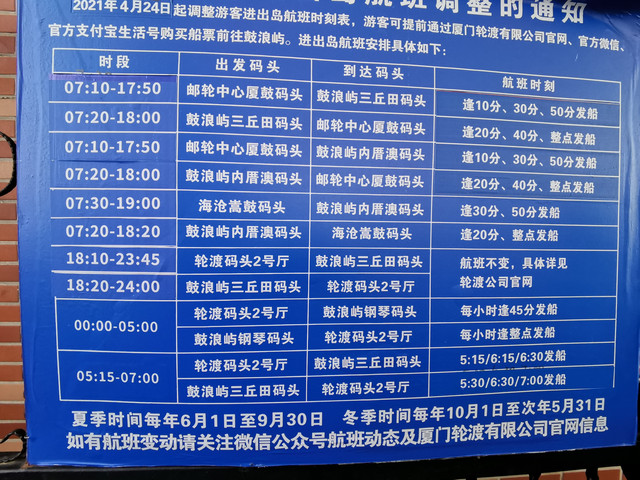 眼前是厦门各岛往返鼓浪屿的轮渡时刻表通告,它与我们出发前查询的班次,又有了很大变化,而且,通告也很难让人一目了然。对此,我们感到很迷惑,为什么一个简简单单的轮渡,就会弄得如此复杂?通告上还搞了一个什么“公司官网”之类的说明,确实有点啼笑皆非!
