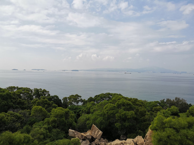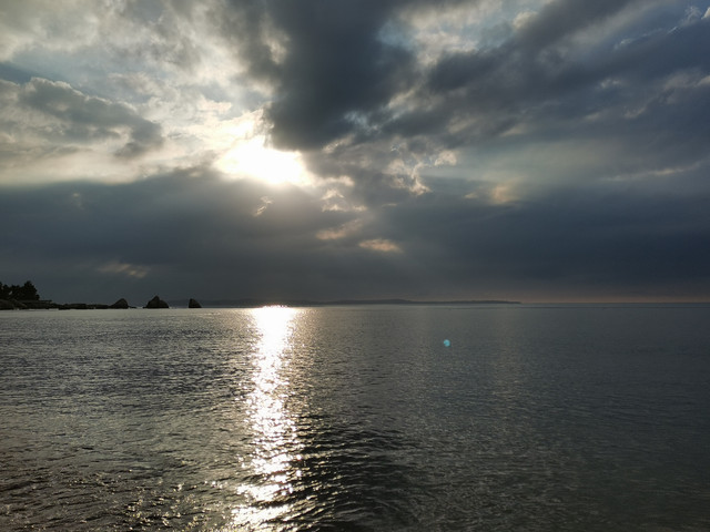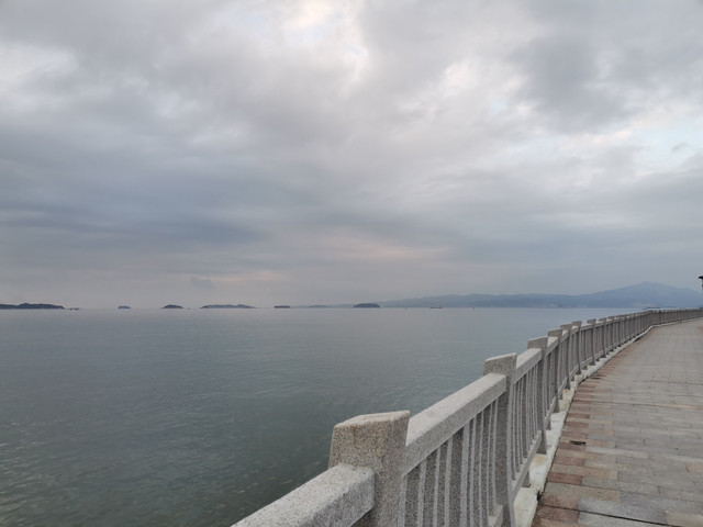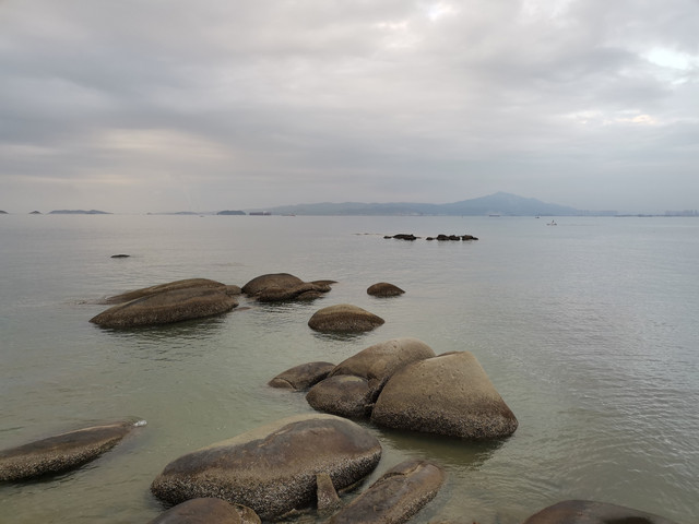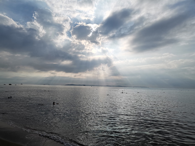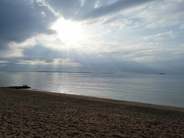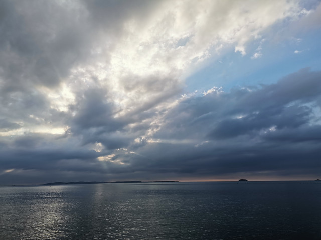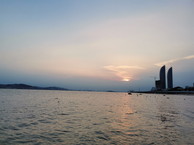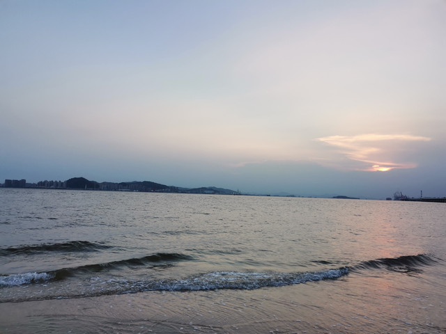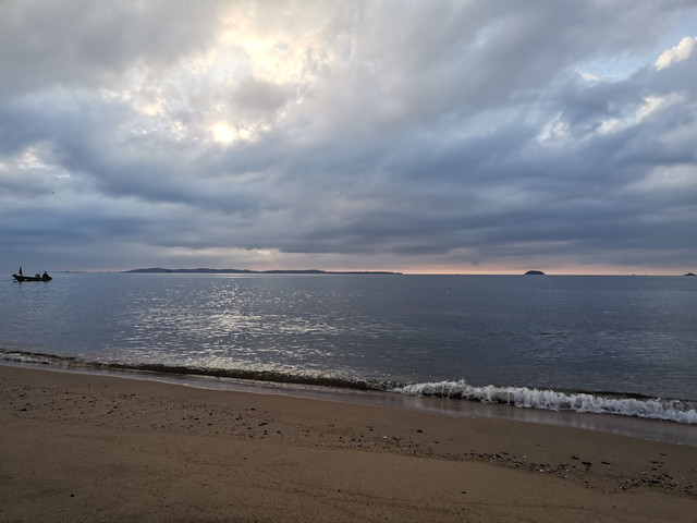 遥远的天际出现了一点鱼肚白,遗憾的是,因为天气缘故,大火球并没有缓缓升起在海平线上。云层遮住了朝晖,天空一半灰白,一半湛蓝,云后的太阳轮廓依稀可见。近海面上飘着零星几叶小舟,朝雾隐隐约约,粼光闪烁,早起的人们已经开始干活了。